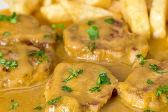 Objevte recept na šťavnaté vepřové maso s luxusní omáčkou a hranolky. Snadná příprava a lahodná chuť. Ideální pro rychlou a chutnou večeři.
