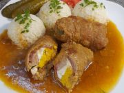Vepřové závitky s rýží: klasika plněná vejcem, okurkou, slaninou a kápí v jemné šťávě