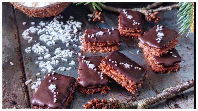 1) Těsto: V míse smíchejte mouku, cukr moučka, máslo, strouhaný kokos, vejce a kakao. Vypracujte hladké těsto a nechte ho v chladu alespoň hodinu odpočívat.