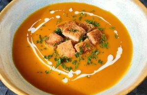 - Dýňová krémová polévka z pečené hokaido – jemná, voňavá a lehce pikantní