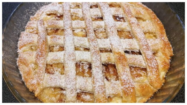 4) Přikrytí koláče: Druhou část těsta rozválejte a nakrájejte na proužky, které použijete k vytvoření mřížky na povrchu koláče. Proužky pečlivě přikládejte a vytvořte tak typický mřížkový vzor. Nakonec koláč propíchejte vidličkou, aby se při pečení netvořily bubliny.