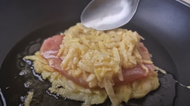 6. Maso namočíme do rozšlehaného vejce na talíři a položíme ho na bramborovou směs na pánvi.