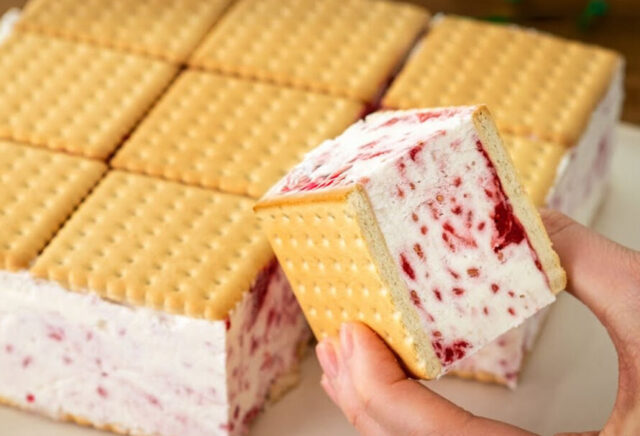 5. Krém naneste na sušenky, přidejte zbytek malinové směsi a opět vmíchejte.