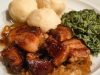 - Vepřové kostky s žampionovou omáčkou a tymiánem, podávané s rýží