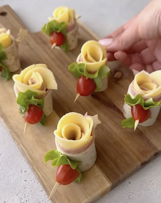 Každou růži zafixujte párátkem, které jí pomůže držet tvar. Přidejte listový salát a cherry rajčátko, které napíchněte na párátko vedle růže. Výsledkem je krásná a chutná růže s barevnými detaily.