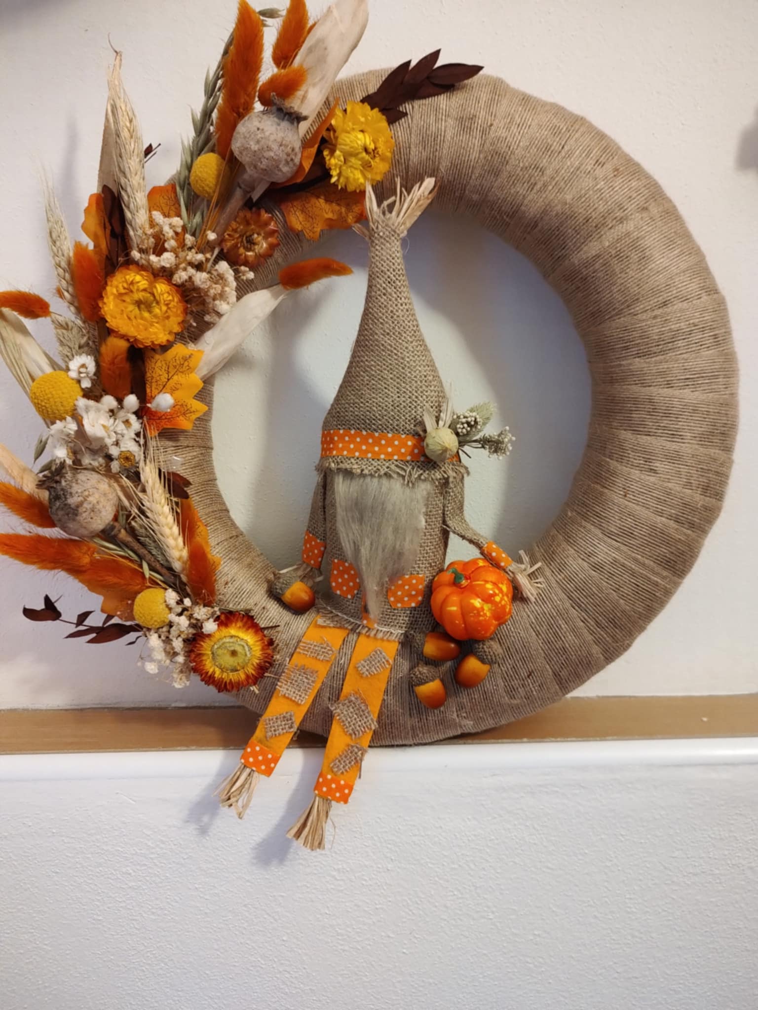 Začněte největšími kusy (listy, klasy, palmy), poté přidejte střední (makovice, chmely) a nakonec detaily (bobotky, jemné traviny). Věnec působí nejlépe, když je aranže soustředěná na jedné straně. K skřítkovi můžete přilepit mini dýni a několik žaludů.