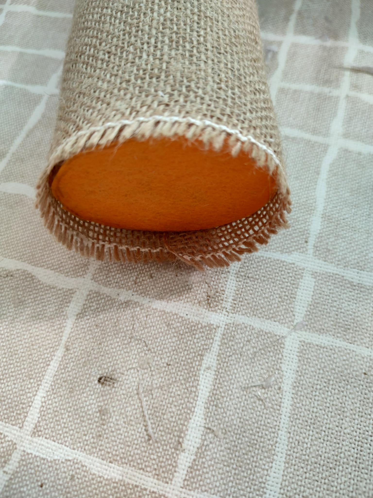Lahvičku podle potřeby zkraťte. Obalte ji jutovinou – na dno nalepte kolečko z oranžového filcu, horní okraj nechte roztřepený.