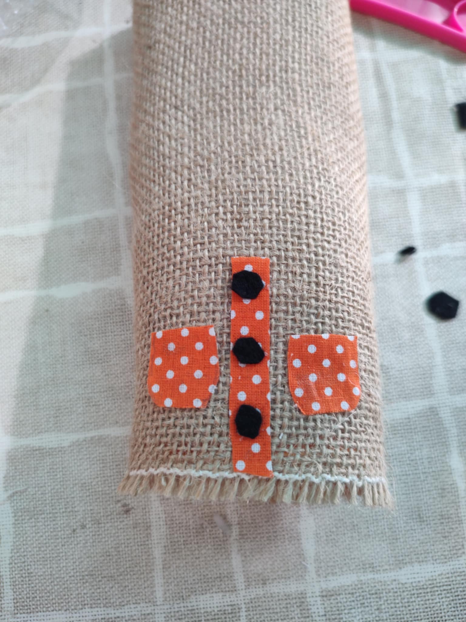 Ze stuhy vytvořte „légu“ a z černého filcu nalepte knoflíky. Oranžové kapsy vyřízněte z filcu a přilepte.
