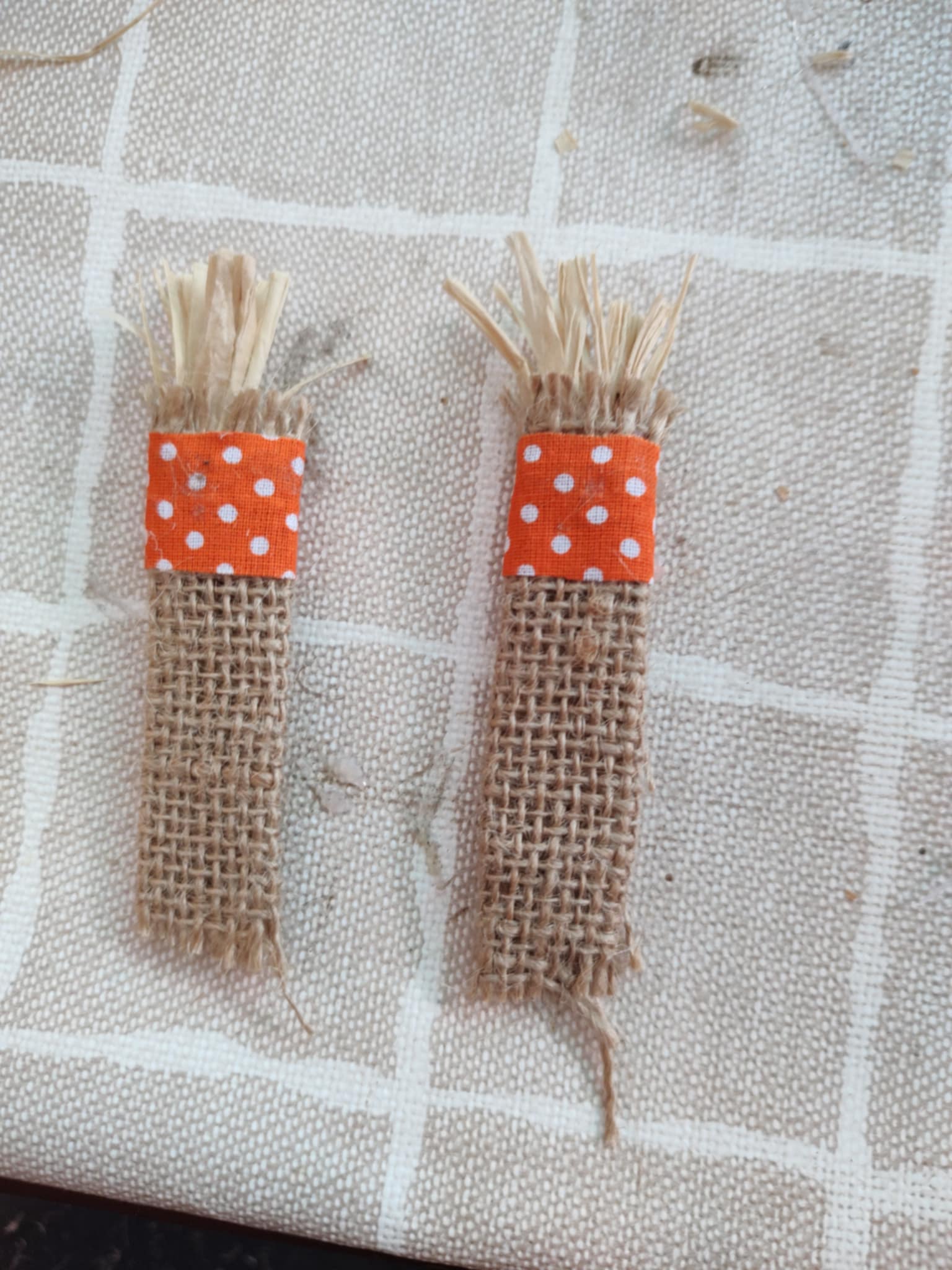Ze dvou proužků oranžového filcu udělejte nohy. Konce rozstřihněte a vložte kousek rafie jako třásně; přelepte stuhou. Přidejte jutové „záplaty“.
