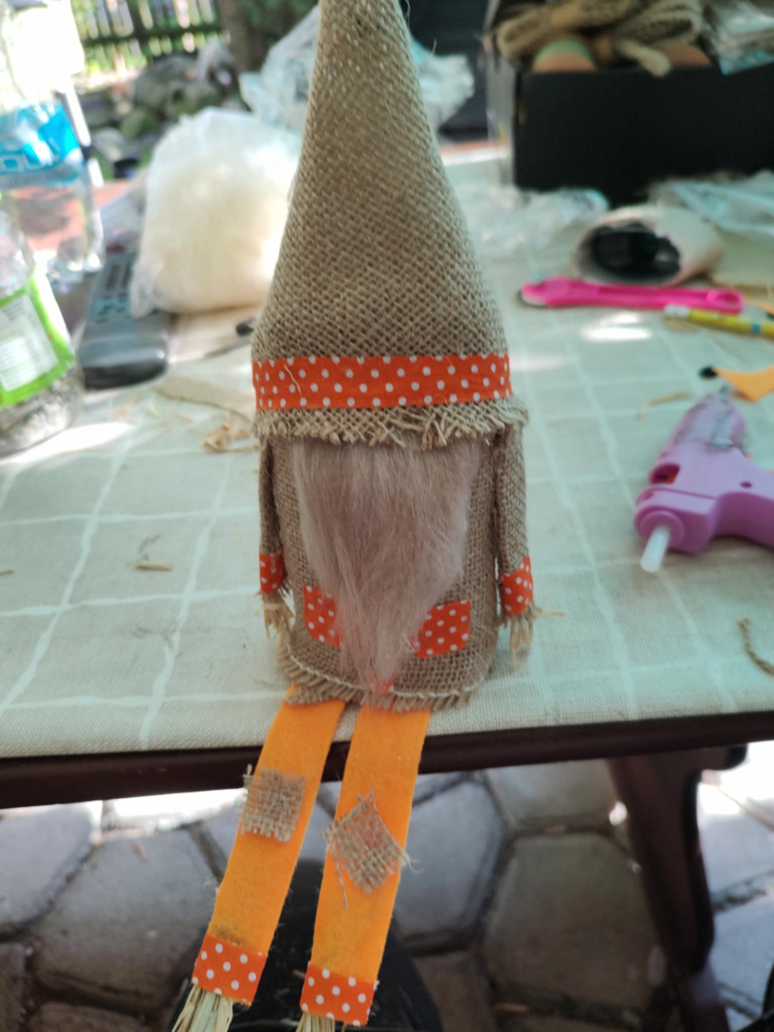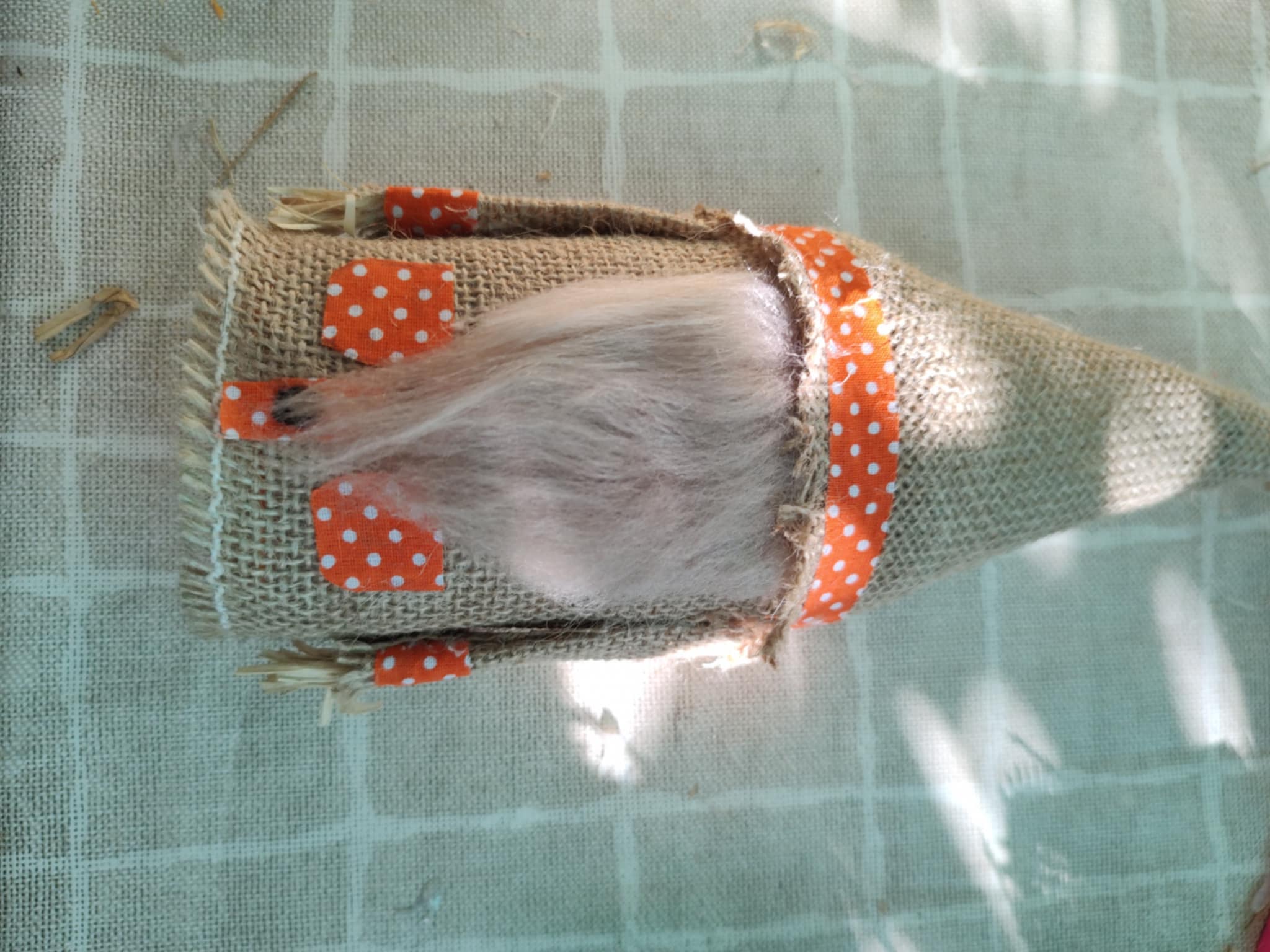 - jutovina (kabátek + čepice), oranžový filc (kalhoty), kousek černého filcu (knoflíky)