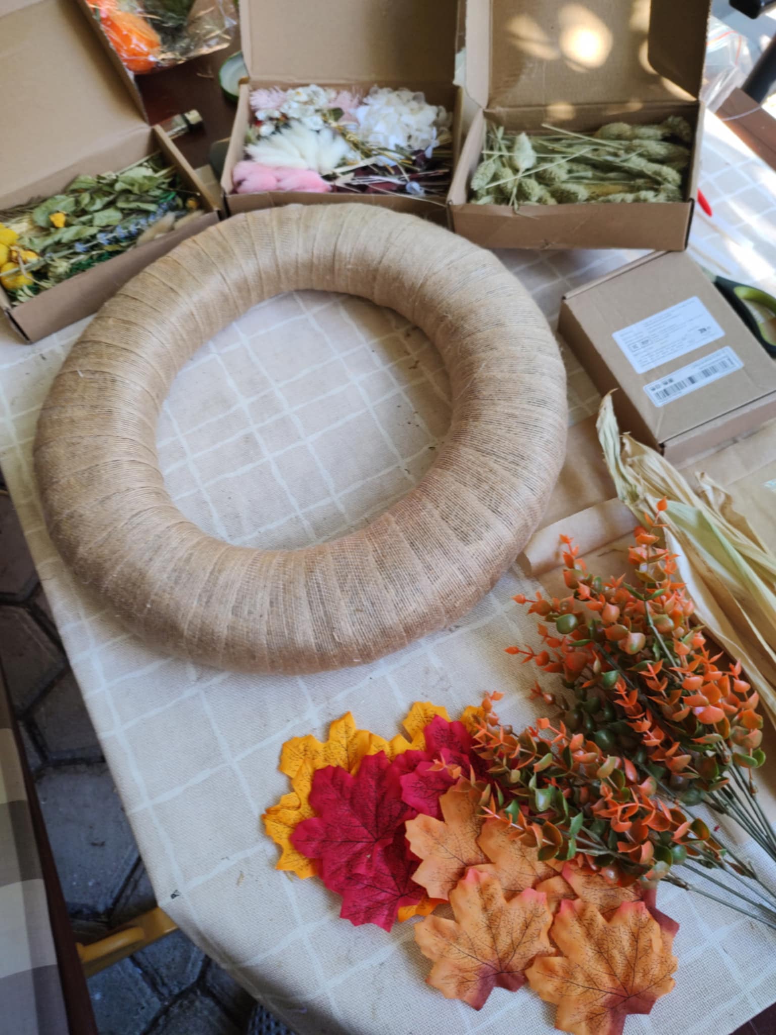 - sušené rostliny a dekorace: listy, traviny, klasy, makovice, kermec, sušenky, lístky, mini dýně, žaludy