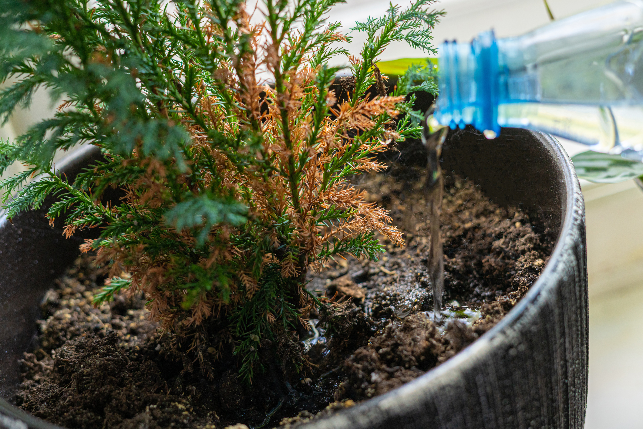 Smíchejte 17 g sušeného droždí (nebo 50 g čerstvého), 50 ml plnotučného mléka a 5 l vody. Nechte 30 minut aktivovat, poté použijte jako jemný postřik na jehličí a k lehké zálivce ke kořenům.