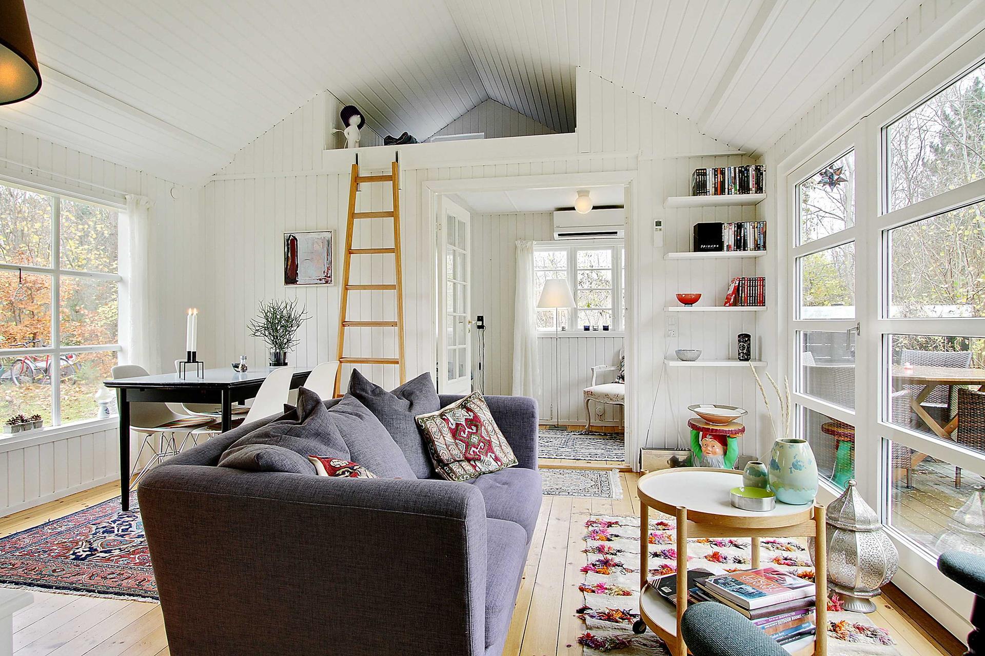 Celý dům má přibližně 43 metrů čtverečních, ale díky chytrému využití světla a prostoru působí dvojnásobně větší. Vysoký strop v obývací části dodává vzdušnost, zatímco dřevěné detaily zjemňují celkový dojem.