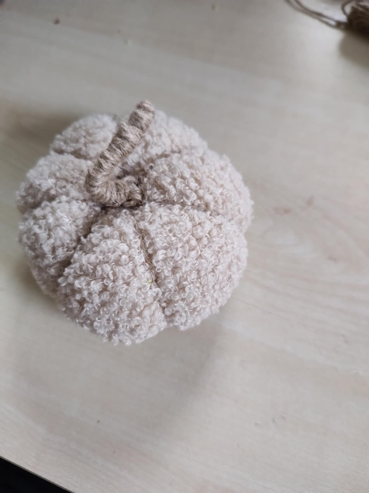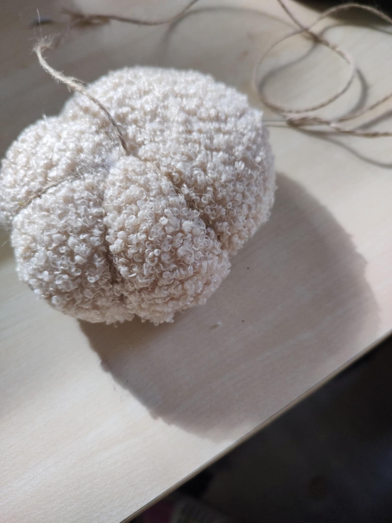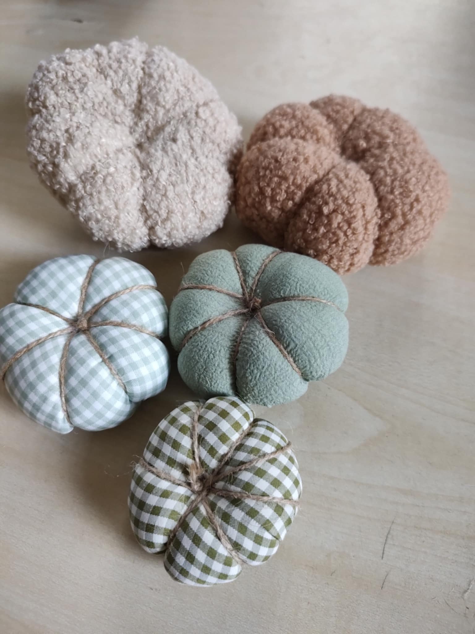 Základem je látka – na fotografiích je vidět látka s kožešinovým/beránkovým efektem v krémové barvě a také látky s jemným kostkovaným vzorem v podzimních odstínech (mintově zelená, hnědá). Dále potřebujete výplň (duté vlákno nebo vata), jutový provázek (nebo pevnou nit v barvě látky), jehlu s větším ouškem, nůžky a tavnou pistoli pro upevnění stopky.