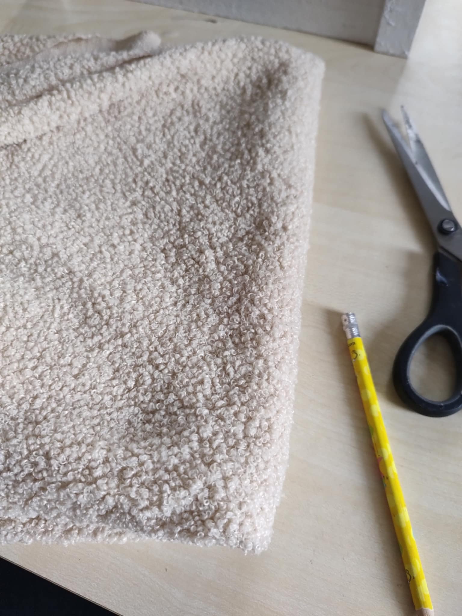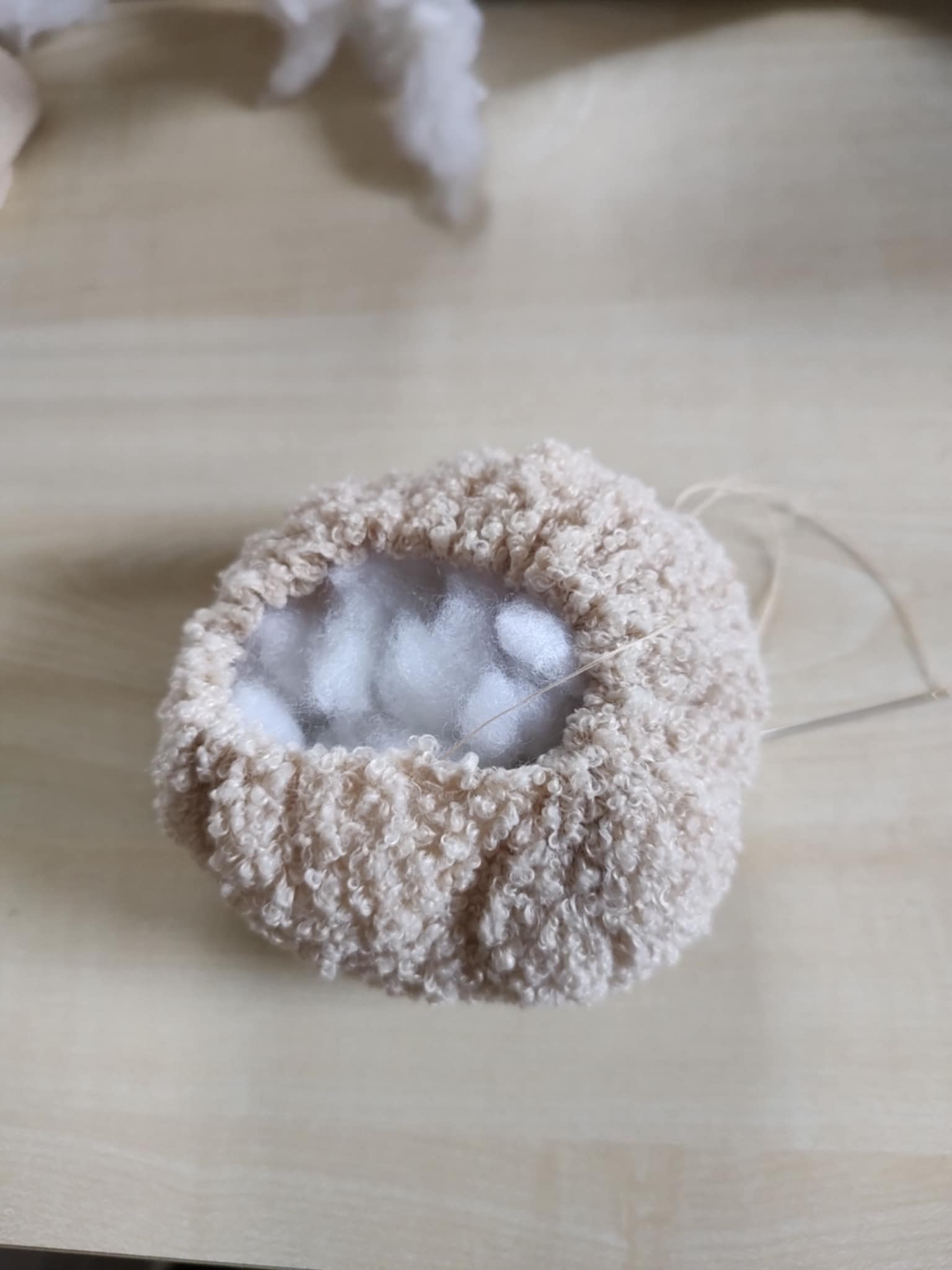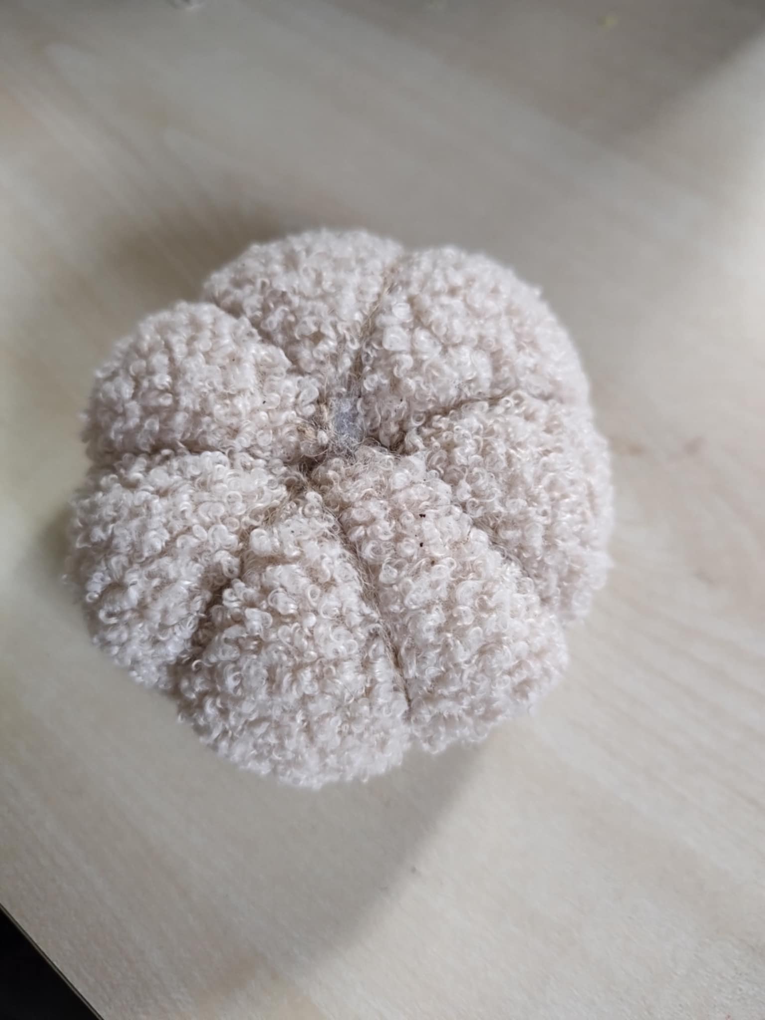 Základem je látka – na fotografiích je vidět látka s kožešinovým/beránkovým efektem v krémové barvě a také látky s jemným kostkovaným vzorem v podzimních odstínech (mintově zelená, hnědá). Dále potřebujete výplň (duté vlákno nebo vata), jutový provázek (nebo pevnou nit v barvě látky), jehlu s větším ouškem, nůžky a tavnou pistoli pro upevnění stopky.