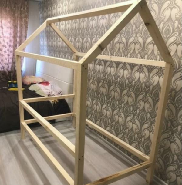 Když byl základ hotový, začala postýlka získávat svůj charakter. Dřevěné trámy tvořily tvar domu a s každým dalším krokem bylo zřejmé, že se rodí něco opravdu jedinečného. Otec doplnil konstrukci o boční „stěny“, které nejen zpevňují celou postel, ale zároveň zvyšují bezpečnost dítěte. Dolní část tvoří pevný rošt, na který později přišla matrace.