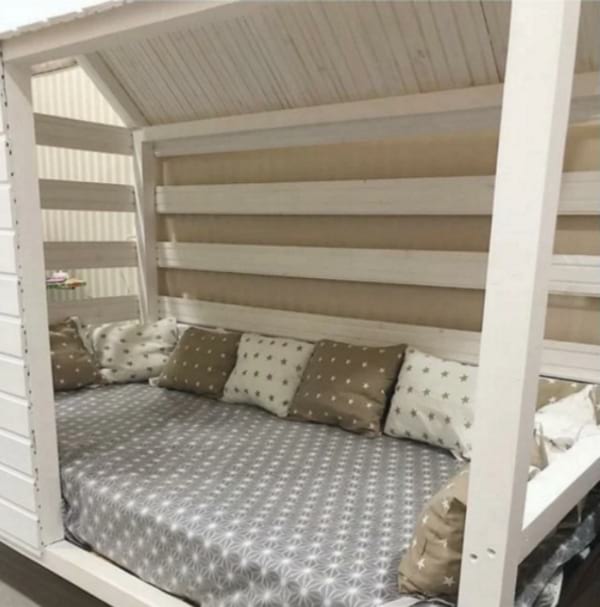 Nakonec dostala postýlka i střechu a malá okénka. A tím se proměnila v opravdový domeček – s atmosférou, kterou běžná dětská postel nikdy nenabídne. Výsledek působí kouzelně, ale zároveň prakticky.