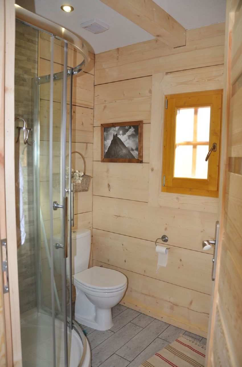 V přízemí se nachází i malá, ale plně vybavená kuchyně s jídelním koutem. Dřevěný stůl, otevřené police, keramika a jednoduché osvětlení vytvářejí domáckou atmosféru. Z kuchyně je vstup do koupelny, která je překvapivě prostorná – nechybí sprchový kout, toaleta ani dostatek místa na drobnosti.