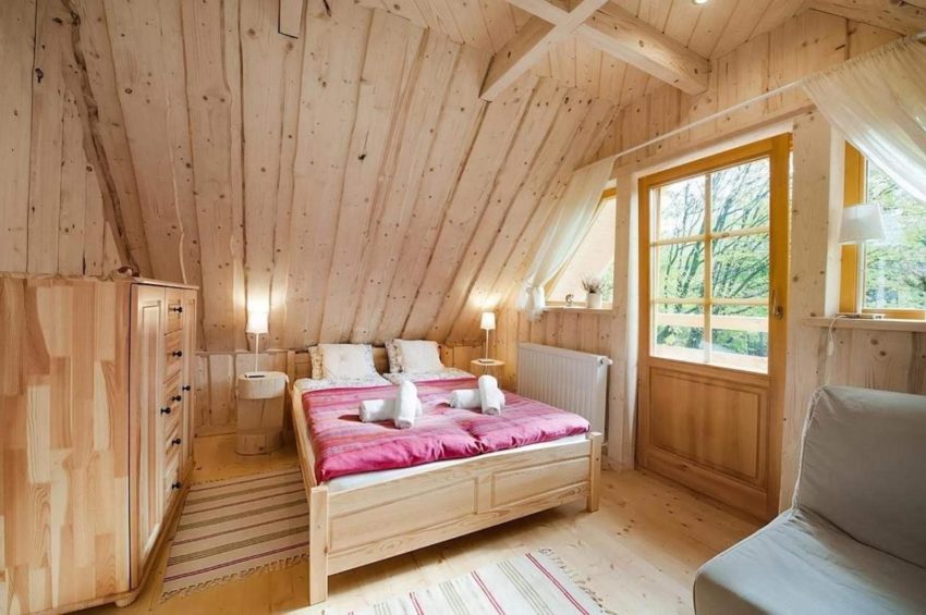 Po dřevěných schodech se vystoupá do podkroví, kde se nachází ložnice s dvojlůžkem a přístupem na malý balkon. Ráno tudy proudí měkké světlo, které se odráží od světlých dřevěných stěn a vytváří hřejivou atmosféru. Ložnice je jednoduchá, ale působí mimořádně klidně – ideální místo pro odpočinek po dni stráveném v přírodě.