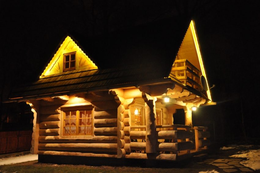 Už samotný exteriér srubu působí dojmem tepla a ruční poctivé práce. Tradiční konstrukce z masivních dřevěných trámů doplněná o detaily jako zdobené zábradlí nebo dřevěné dveře s kováním okamžitě navodí atmosféru horské chalupy. Přední terasa zve k ranní kávě i večernímu posezení, zatímco světla pod střechou v noci srub promění v romantické útočiště.