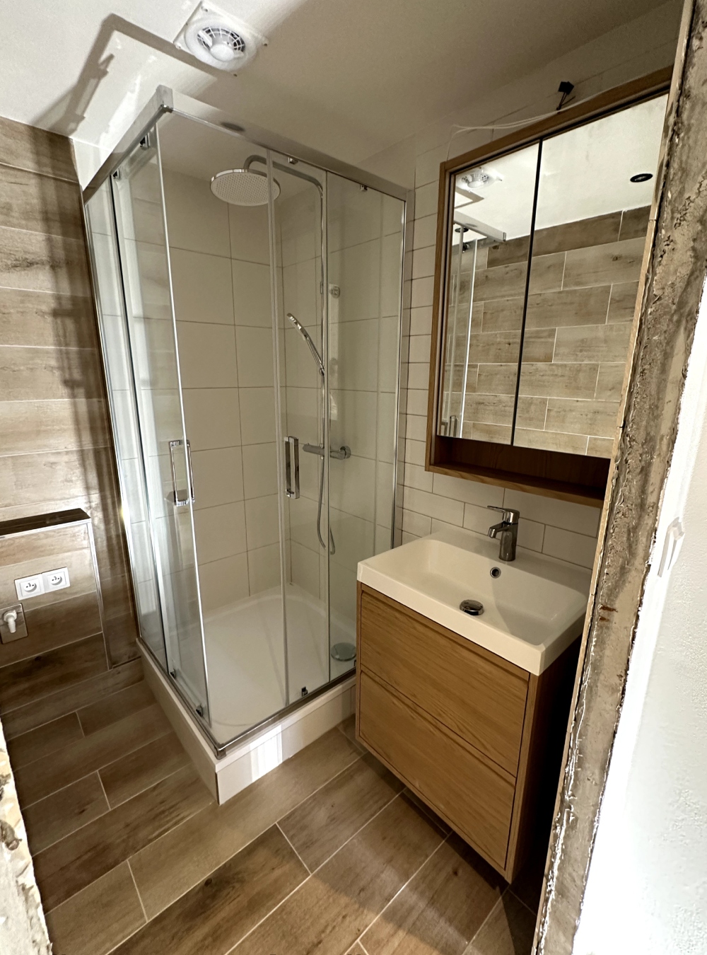 Do koupelny byl instalován prostorný sprchový kout s prosklenou zástěnou, který nahradil starou malou vaničku. Pod umyvadlo byla vybrána závěsná skříňka v dekoru dřeva, která nejen dobře vypadá, ale také poskytuje praktický úložný prostor.