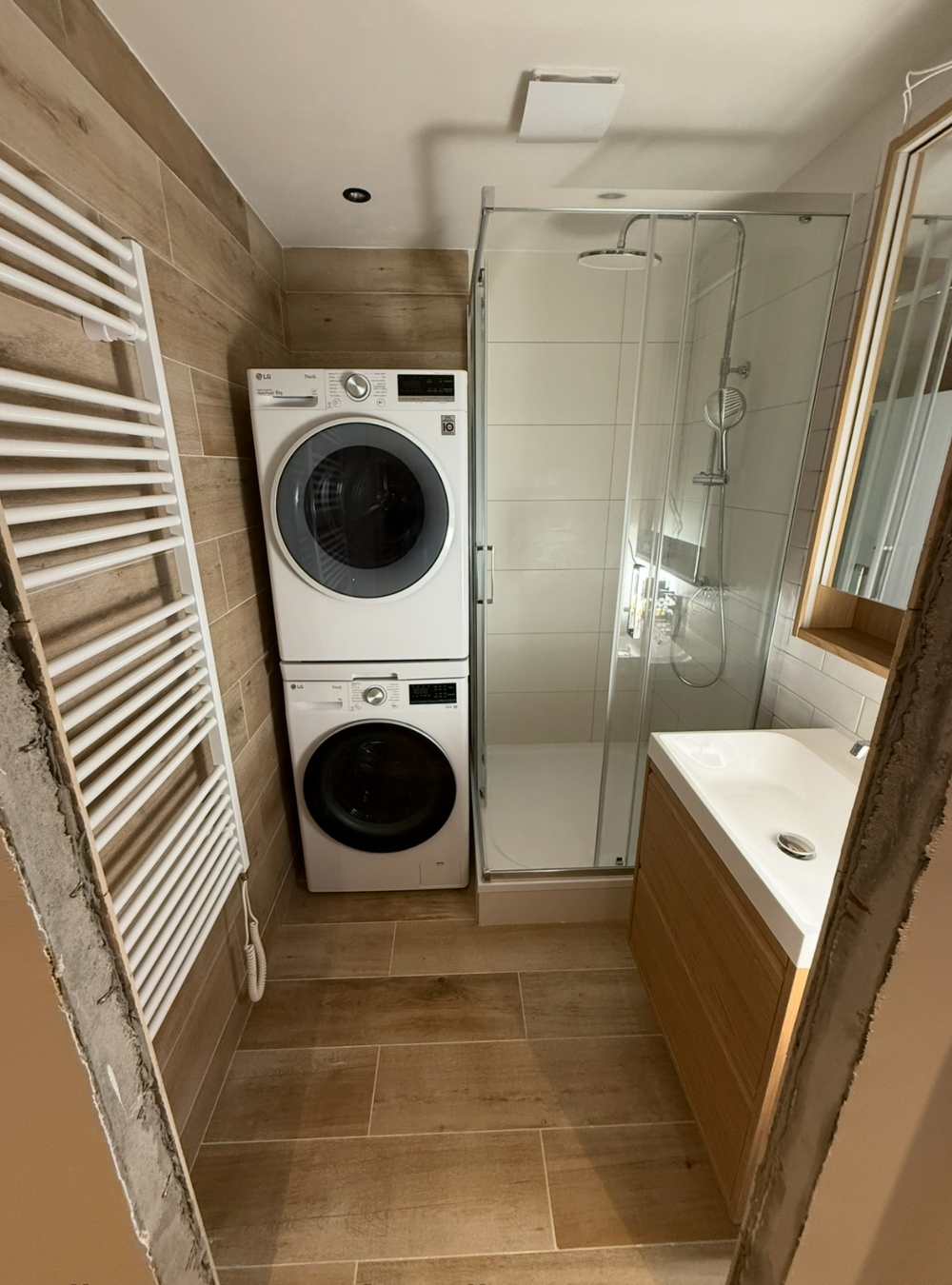 Praktickým prvkem, který výrazně zvýšil komfort, bylo umístění pračky a sušičky přímo do koupelny. Díky tomu odpadlo hledání místa jinde v bytě. Spotřebiče byly nainstalovány nad sebe, což šetří místo a zároveň zajišťuje snadnou dostupnost.