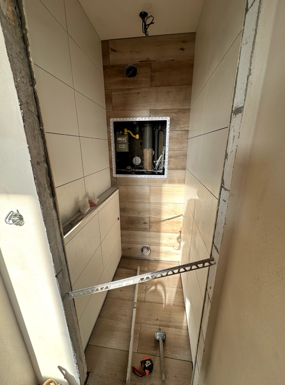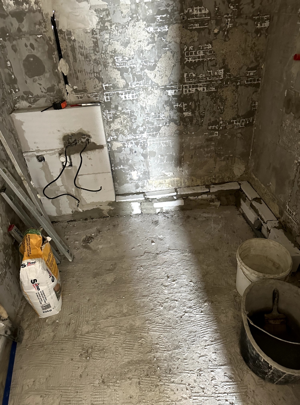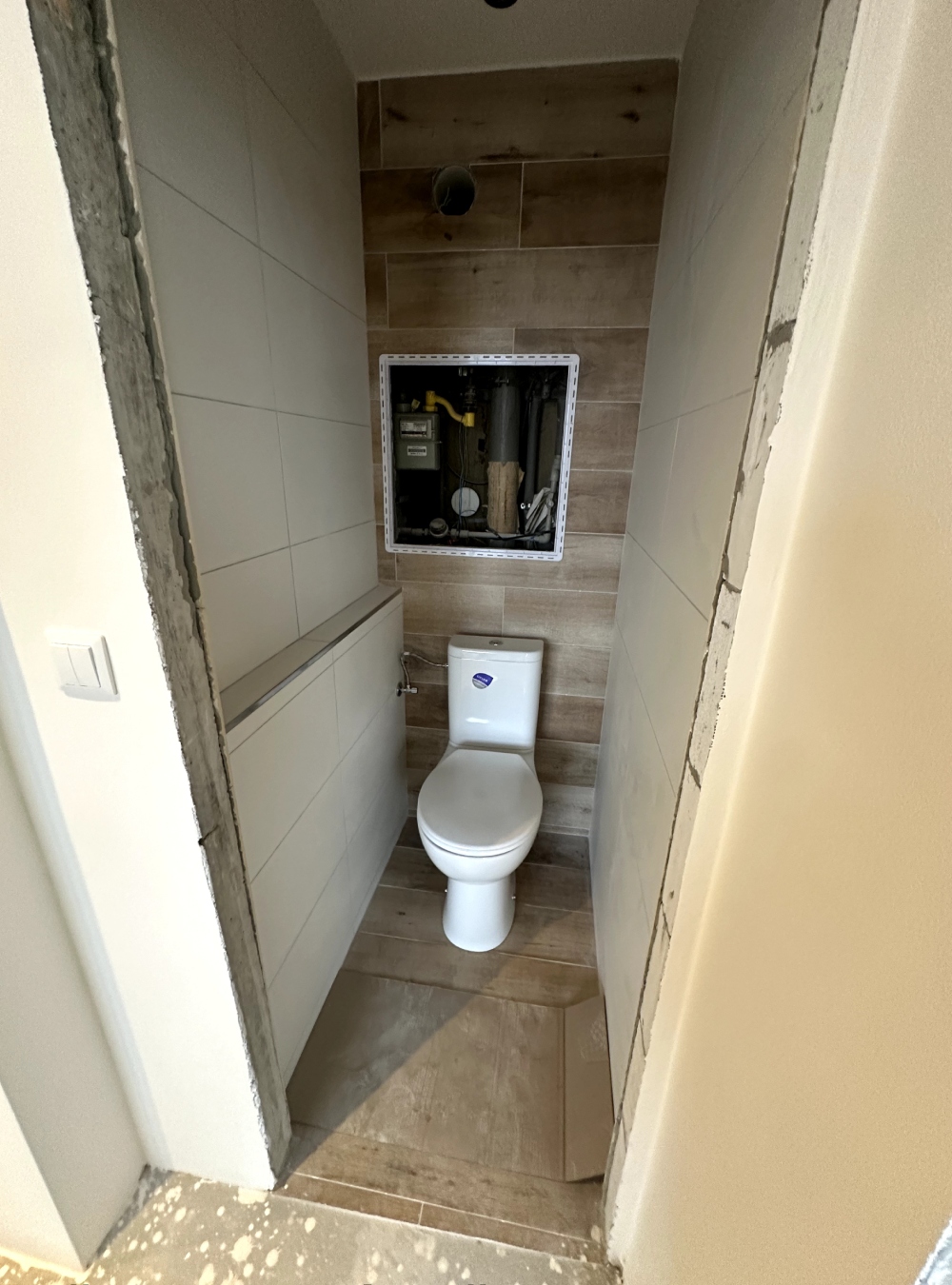 Celá proměna začala bouráním starého jádra. Odstraněny byly nejen původní obklady a sanita, ale i staré vedení vody a odpadů. To umožnilo vybudovat nové rozvody a navrhnout koupelnu i toaletu zcela od základu. Už v této fázi bylo jasné, že výsledkem nebude jen kosmetická změna, ale kompletní modernizace.