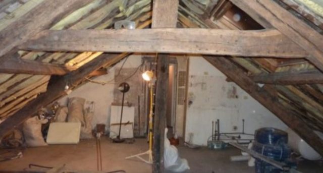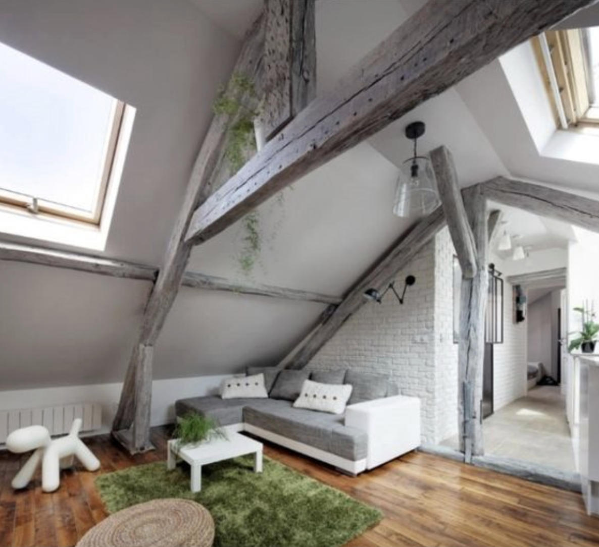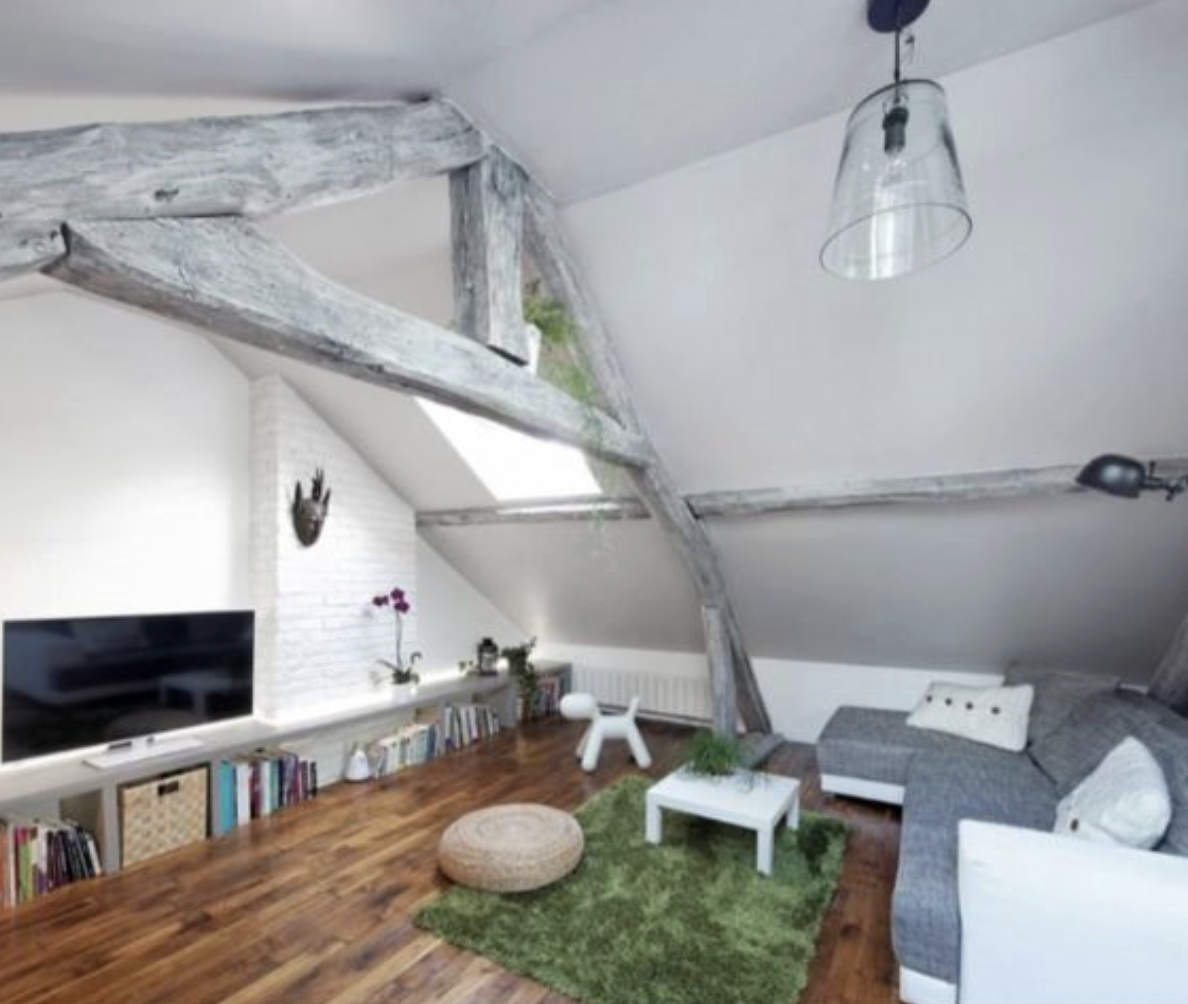 V obývací části se snoubí minulost s přítomností. Dominují zde původní dřevěné trámy, které byly ponechány v hrubé, rustikální podobě. Ty kontrastují s moderní šedou sedačkou a výrazným, zářivě zeleným chlupatým kobercem. Stěny zdobí odhalené cihly, natřené na bílo, čímž si zachovávají svou texturu. Zajímavým prvkem je i přechod mezi původní dřevěnou podlahou a moderní dlažbou. Díky minimu ozdob se prostor stává ideálním místem pro volnou relaxaci.