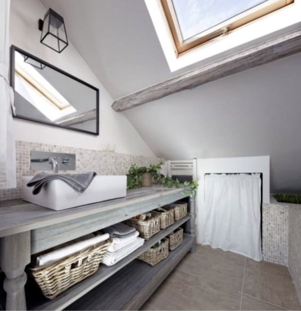 Koupelna je navržena jako fascinující prvek. Je s hlavní obytnou zónou opticky propojena velkými okny, díky nimž se v noci proměňuje v efektní „světelný box“. Vana je obložena drobnou, decentní mozaikou. Proti ní stojí praktické řešení úložného prostoru pod umyvadlem: otevřené police s proutěnými košíčky a ručníky dodávají místu útulný nádech. Koupelna a kuchyně sdílejí denní světlo ze stejných velkých oken, přičemž soukromí v koupelně je zajištěno jednoduchým zatažením závěsů.