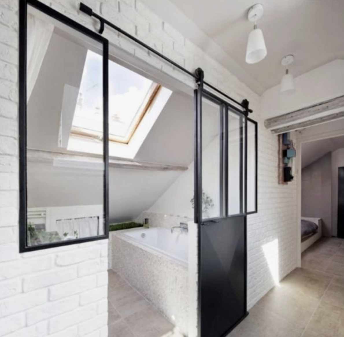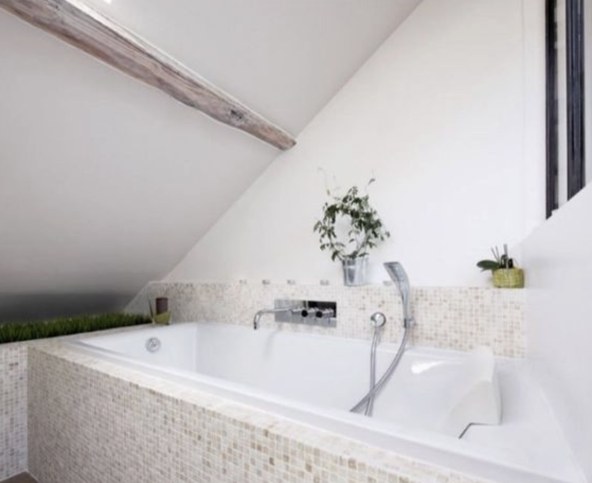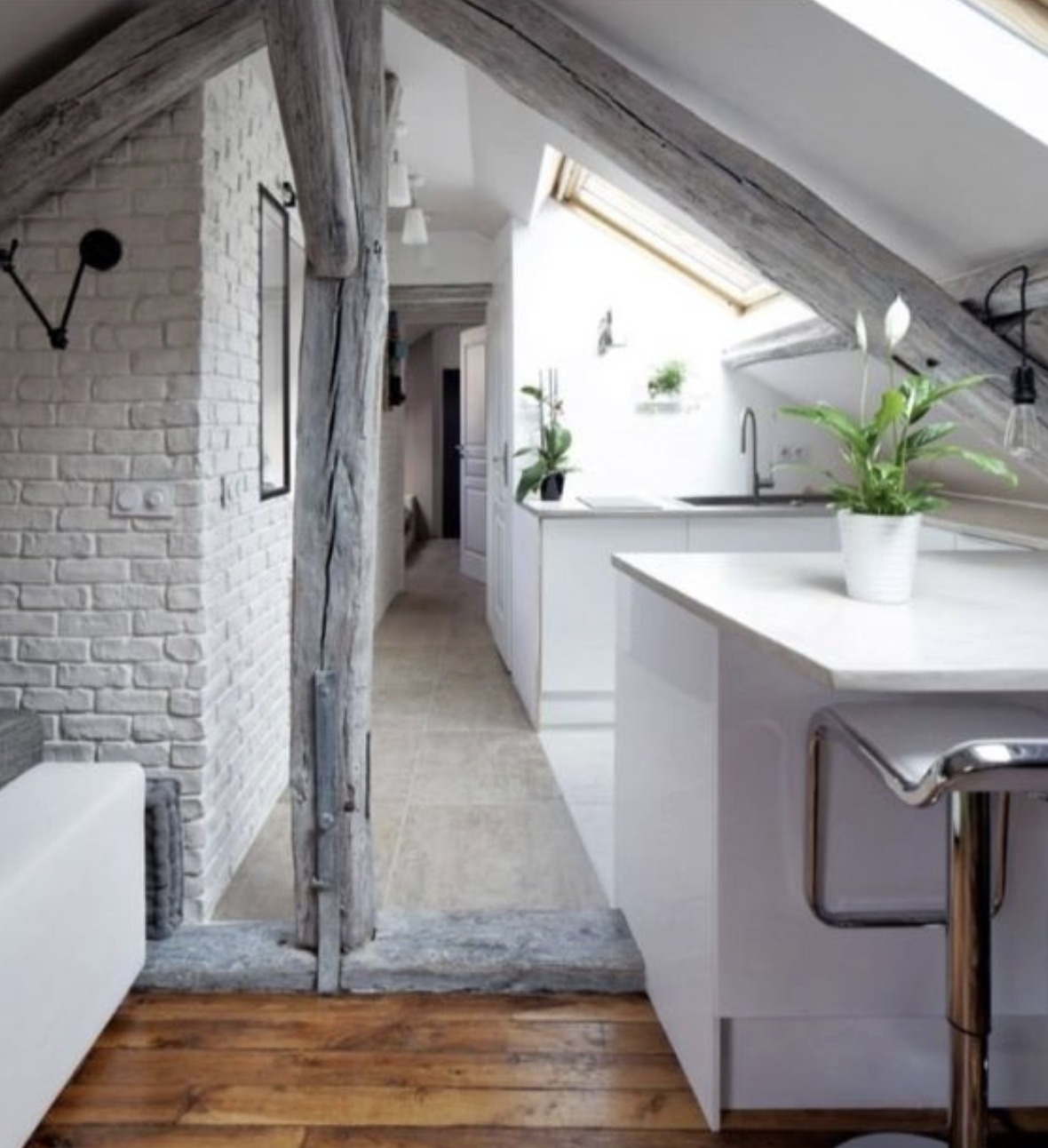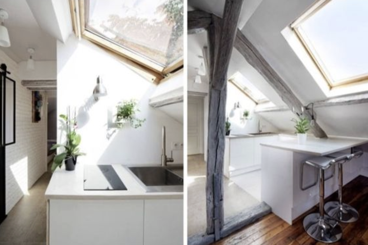 Základním stavebním kamenem designu je bílá barva, která prostor maximálně prosvětluje a dodává mu pocit čistoty a nekonečného prostoru, navzdory šikmým stěnám. Sofistikované akcenty zajišťují elegantní zlaté detaily a uklidňující šedá. O dramatický kontrast se pak postarala výrazná černá barva, například na rámech dveří. Celý byt se drží jednoduché filozofie: minimum nábytku a dekorací pro volné dýchání prostoru.
