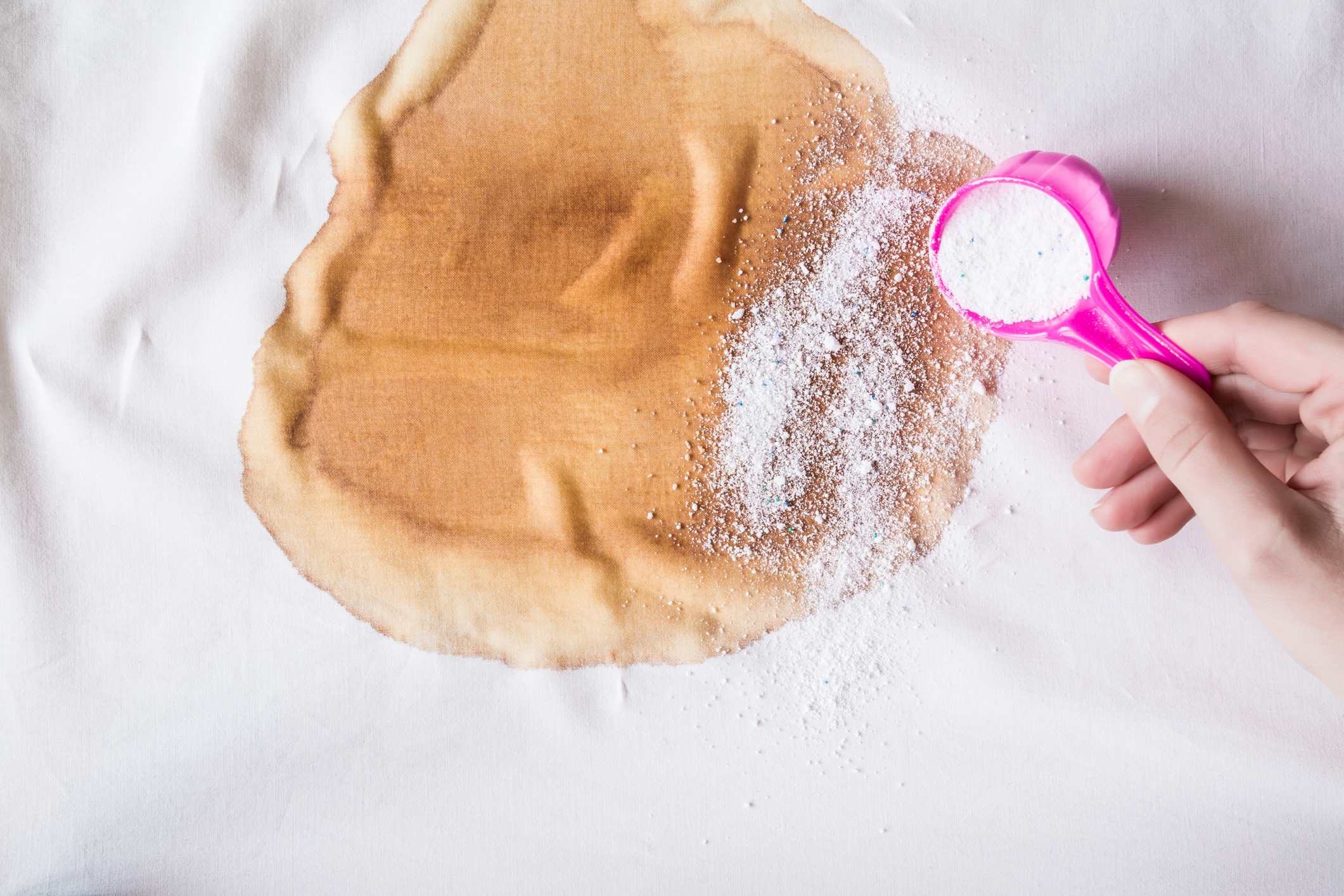 - Sůl nebo jedlá soda: Čerstvou skvrnu nejprve odsajte papírovou utěrkou. Poté ji zasypte velkým množstvím soli nebo jedlé sody. Nechte působit 10–15 minut. Poté opláchněte studenou vodou.
