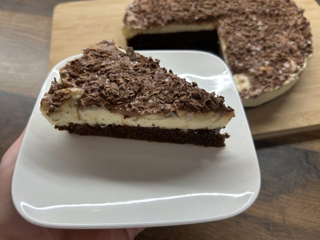 Tento banánový zákusek spojuje jemný kakaový korpus, lehký tvarohovo–pudinkový krém a svěží banány zalité čokoládovou polevou. Dezert je krásně vyvážený – není příliš sladký, ale přesto uspokojí chuť na čokoládu. Skvěle se hodí ke kávě, na rodinné oslavy i jako rychlý domácí moučník do lednice.
