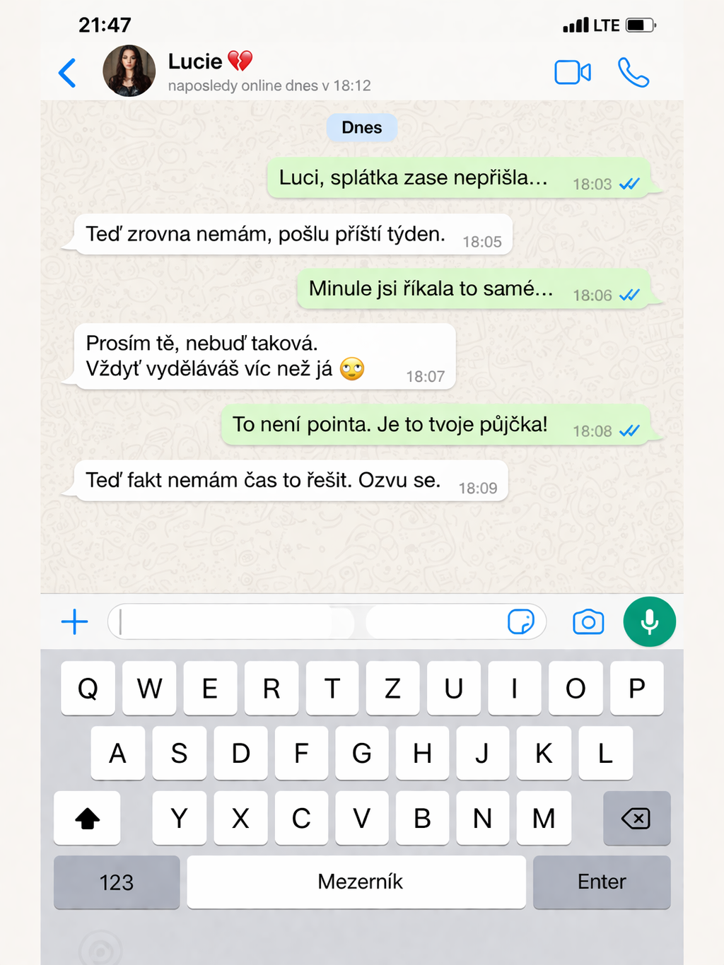 První půlrok byl v klidu. Lucie zářila, koupila si nový iPhone (prý ho potřebuje k práci) a občas mě pozvala na večeři. Jenže pak začaly splátky chodit pozdě. Pak jen polovina. A pak vůbec.