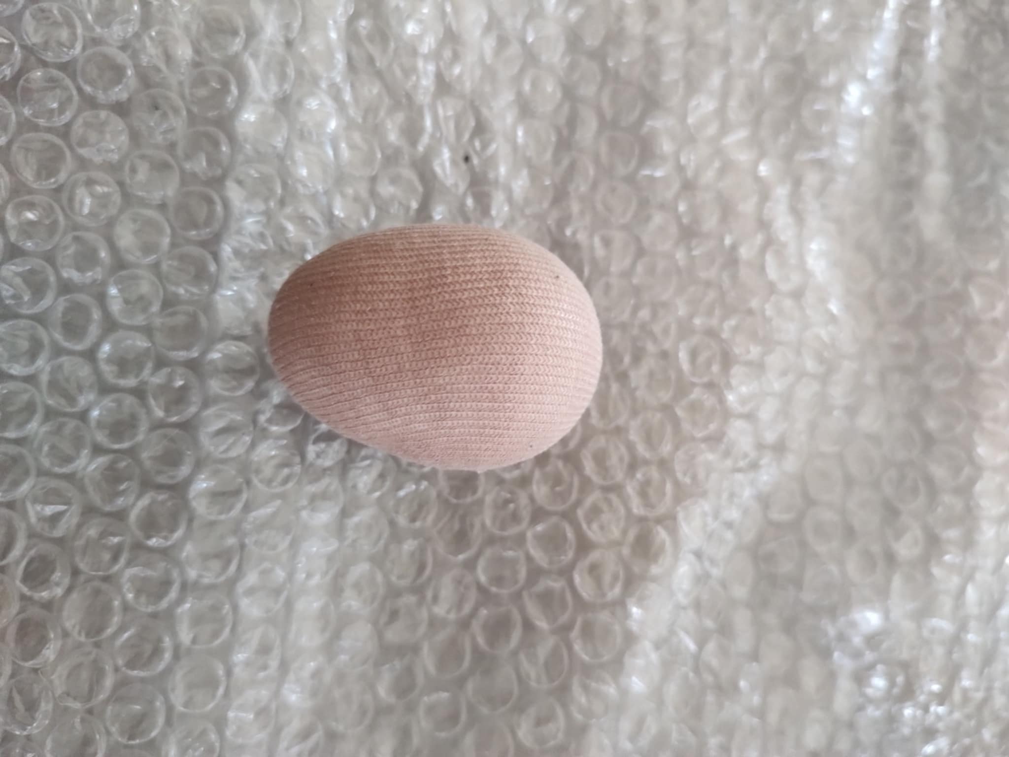 1) Hlava: Polystyrenové vajíčko obalíme kouskem silonky, kterou dole pevně stáhneme. Tím vytvoříme hladký obličej, na který můžeme (ale nemusíme) vyšít očka. Hlavičku napíchneme na špejli.