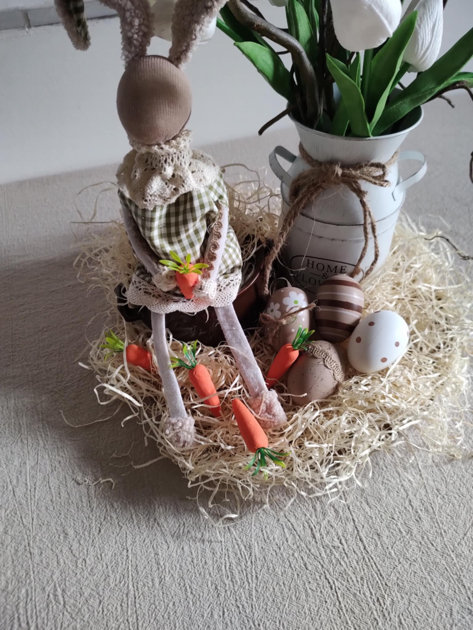 4) Aranžmá: Hotového zajíčka posadíme do „hnízda“ ze dřevité vlny nebo sena. Okolo přidáme malované kraslice, umělé mrkvičky a do pozadí vázu s větvičkami a bílými tulipány.
