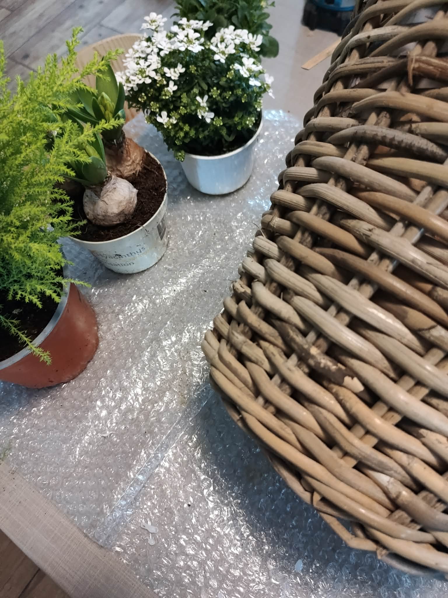 Proutěné koše doporučujeme vyložit pevnou fólií, aby proutí netrpělo vlhkostí při zalévání. Jako první zasaďte dominantní cypřišek do zadní části koše. Ten vytvoří sytě zelené pozadí pro zbytek aranžmá.