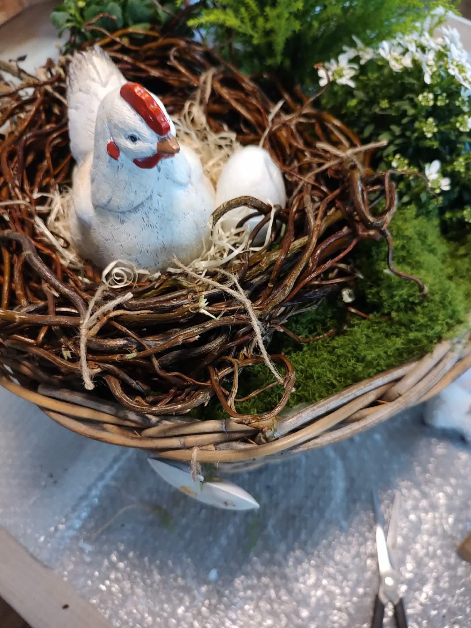 - Přírodní doplňky: Čerstvý mech, proutěné hnízdo a březové větvičky.