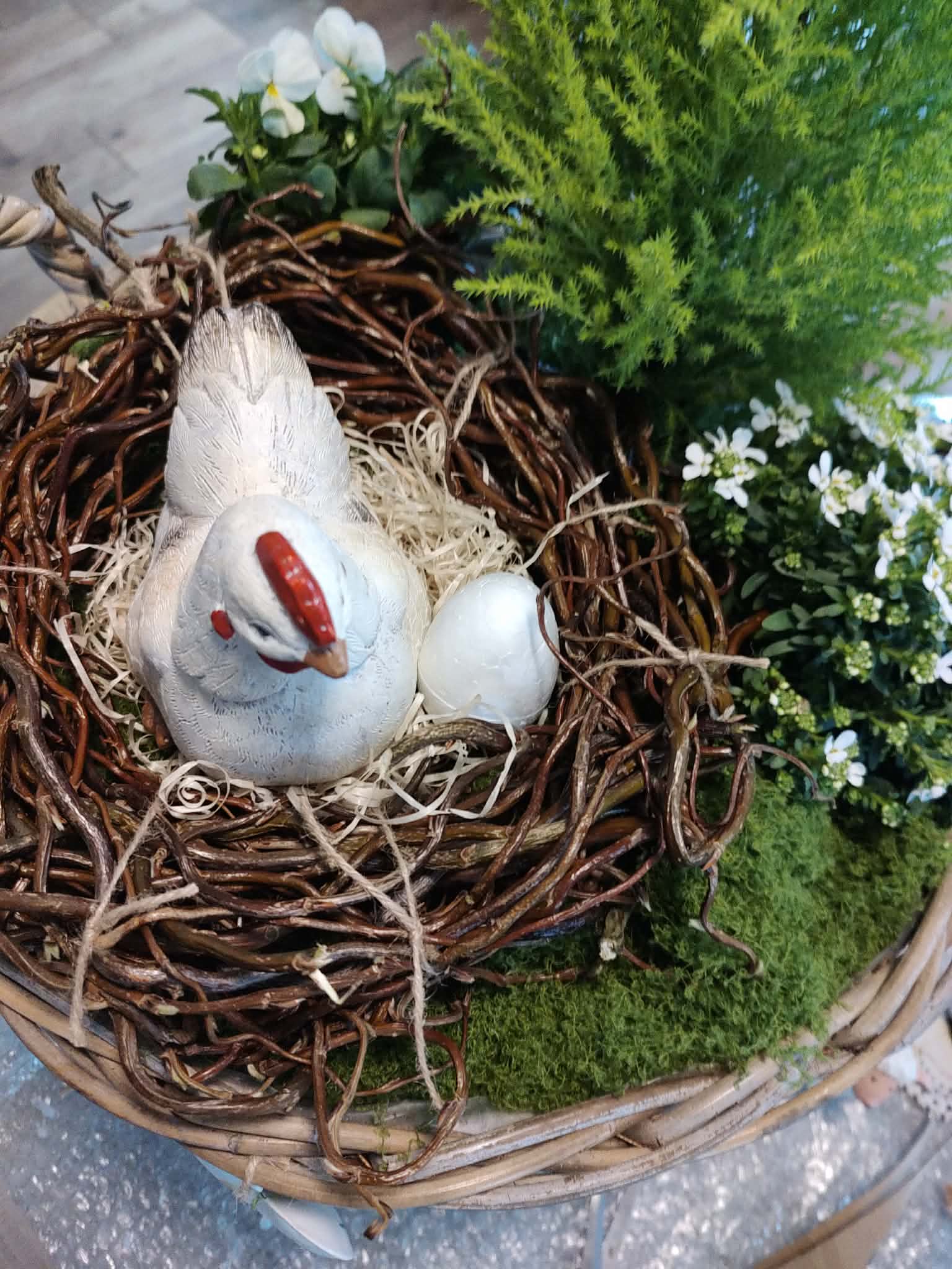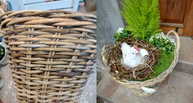 Do vysokého koše umístěte proutěné hnízdo. Do něj posaďte keramickou slepičku a přidejte pár vajíček. Působí to útulně a venkovsky.