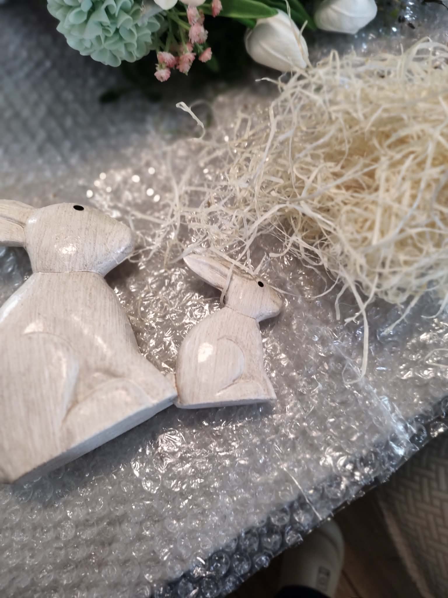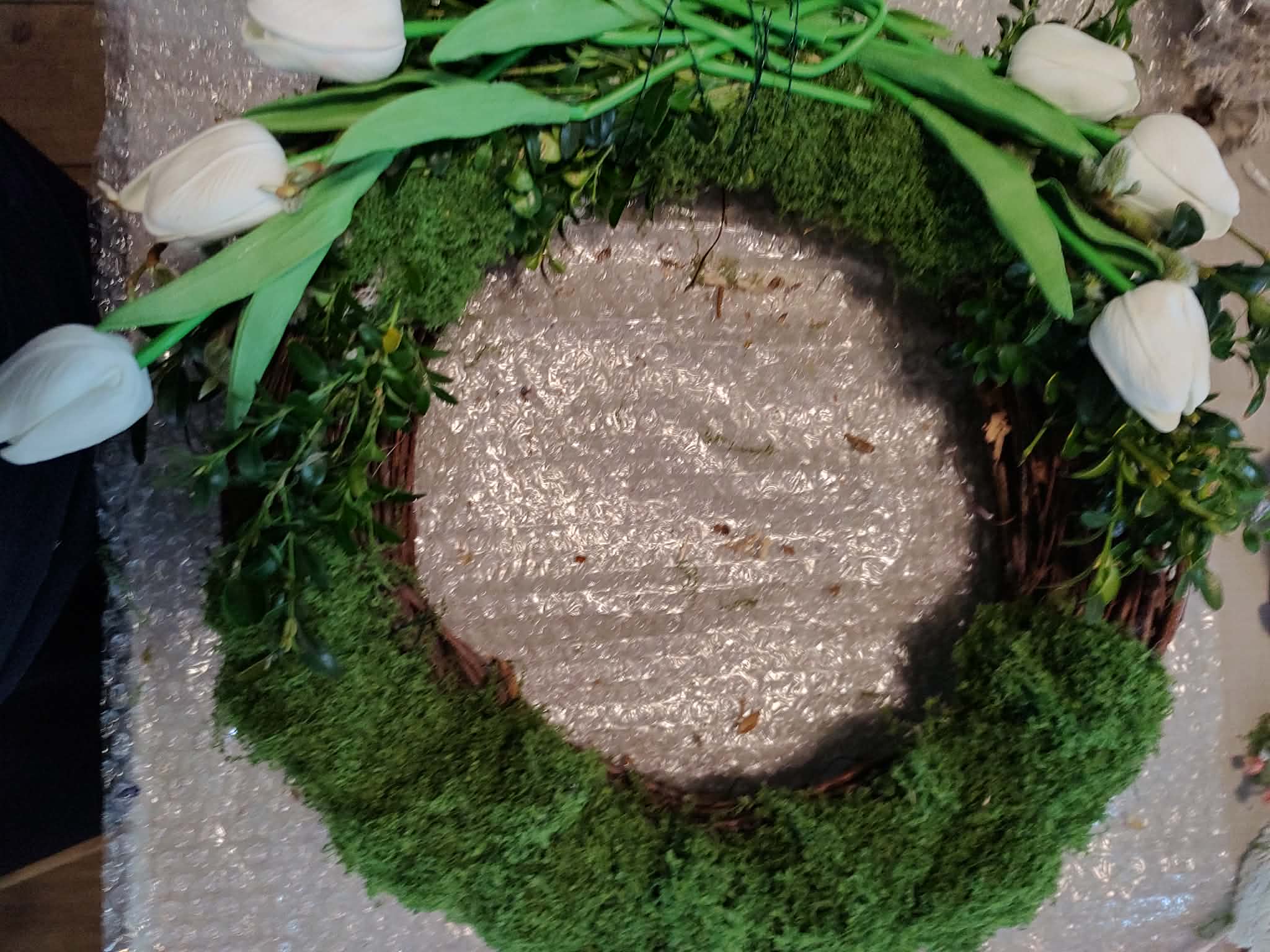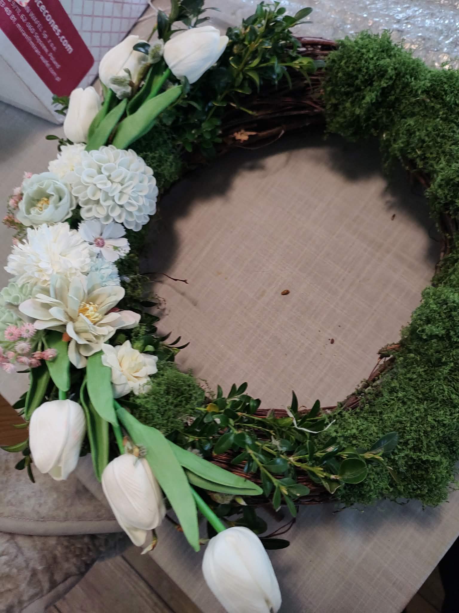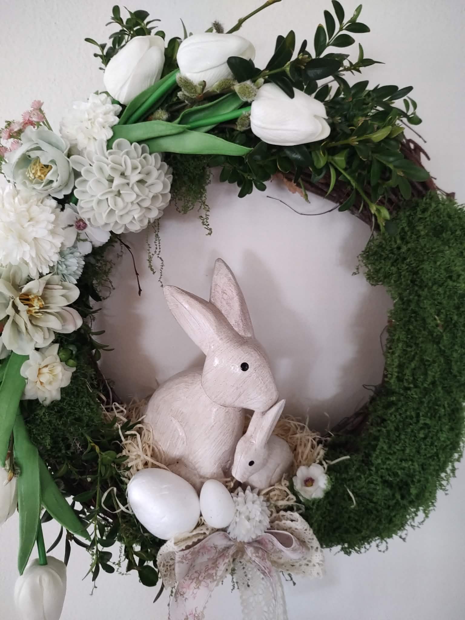 Díky své barevnosti a materiálu se tento věnec skvěle hodí na tmavší dřevěné dveře, kde krásně vyniknou světlé květy a bílé srdce. Stejně dobře ale poslouží jako dekorace na stěnu v interiéru – například v předsíni nebo nad jídelním stolem, kde vám bude připomínat jaro, i když venku zrovna prší.