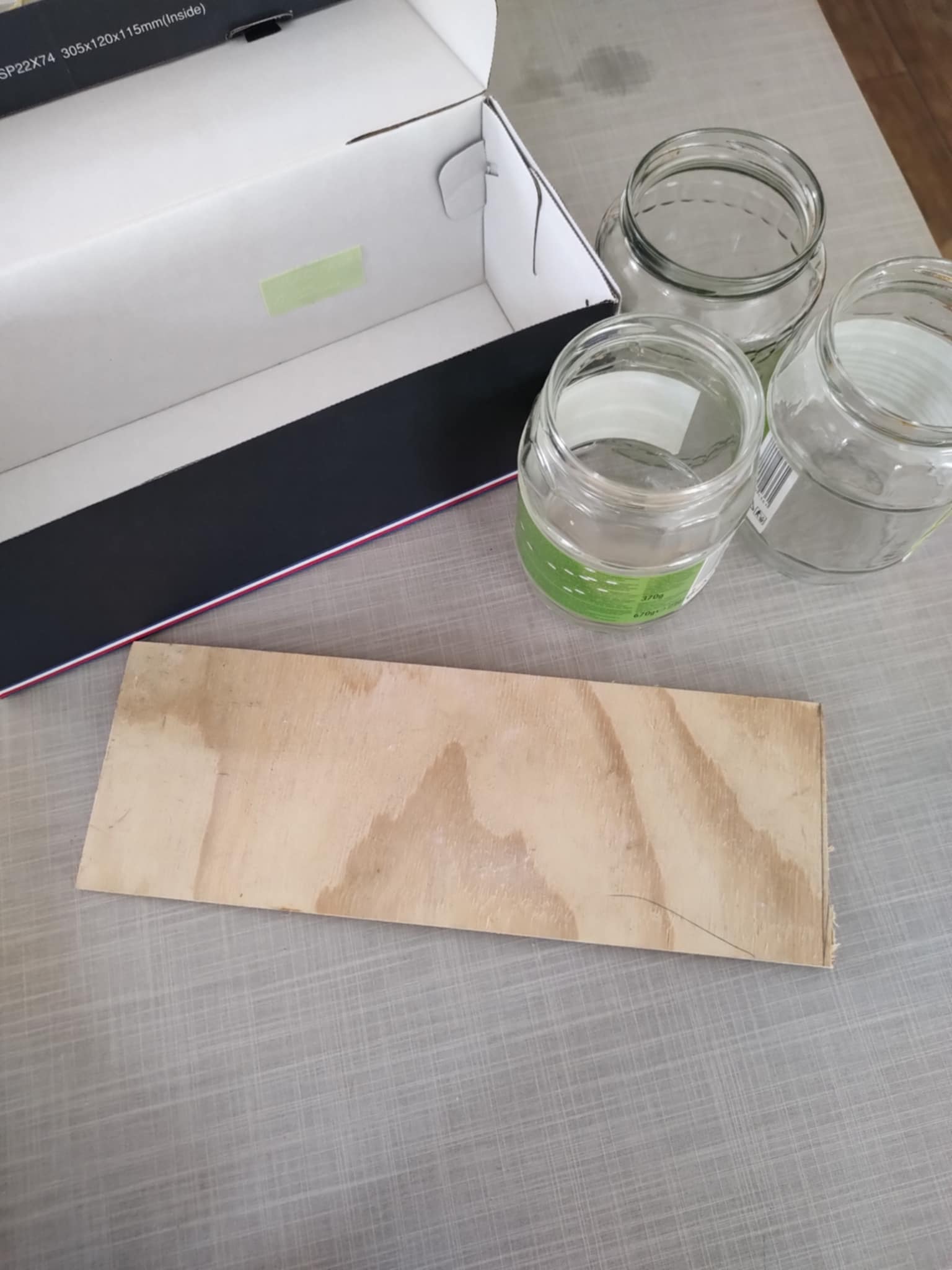 Základem je pevná kartonová krabice s nízkými okraji. Dále si připravte skleněné dózy nebo zavařovací sklenice (na fotografiích jsou tři). Klíčové materiály pro zdobení jsou jutový provázek (silnější na okraje a tenčí na obalení dóz), široká jutová stuha nebo látka, bílý provázek (nebo tenká přírodní šňůra) na obalení krabice a bílá krajka či stužka. K upevňování použijte tavnou pistoli a nůžky. Pro doplňkovou dekoraci je potřeba kousek překližky nebo dřevěné tabulky se zvoleným nápisem.