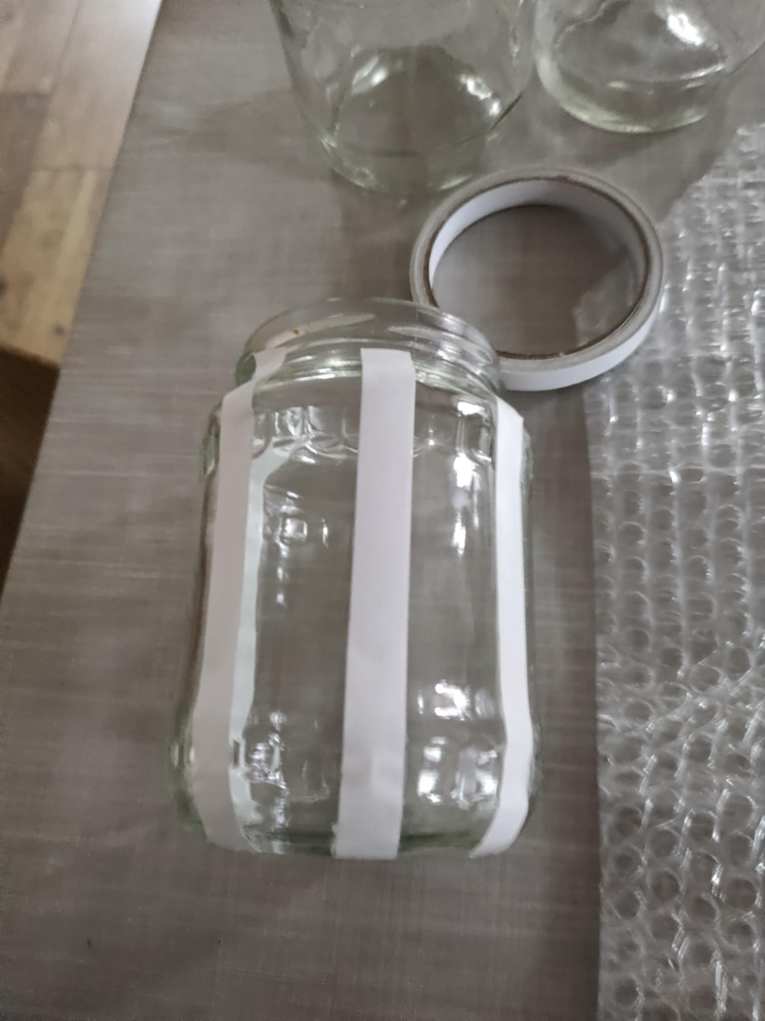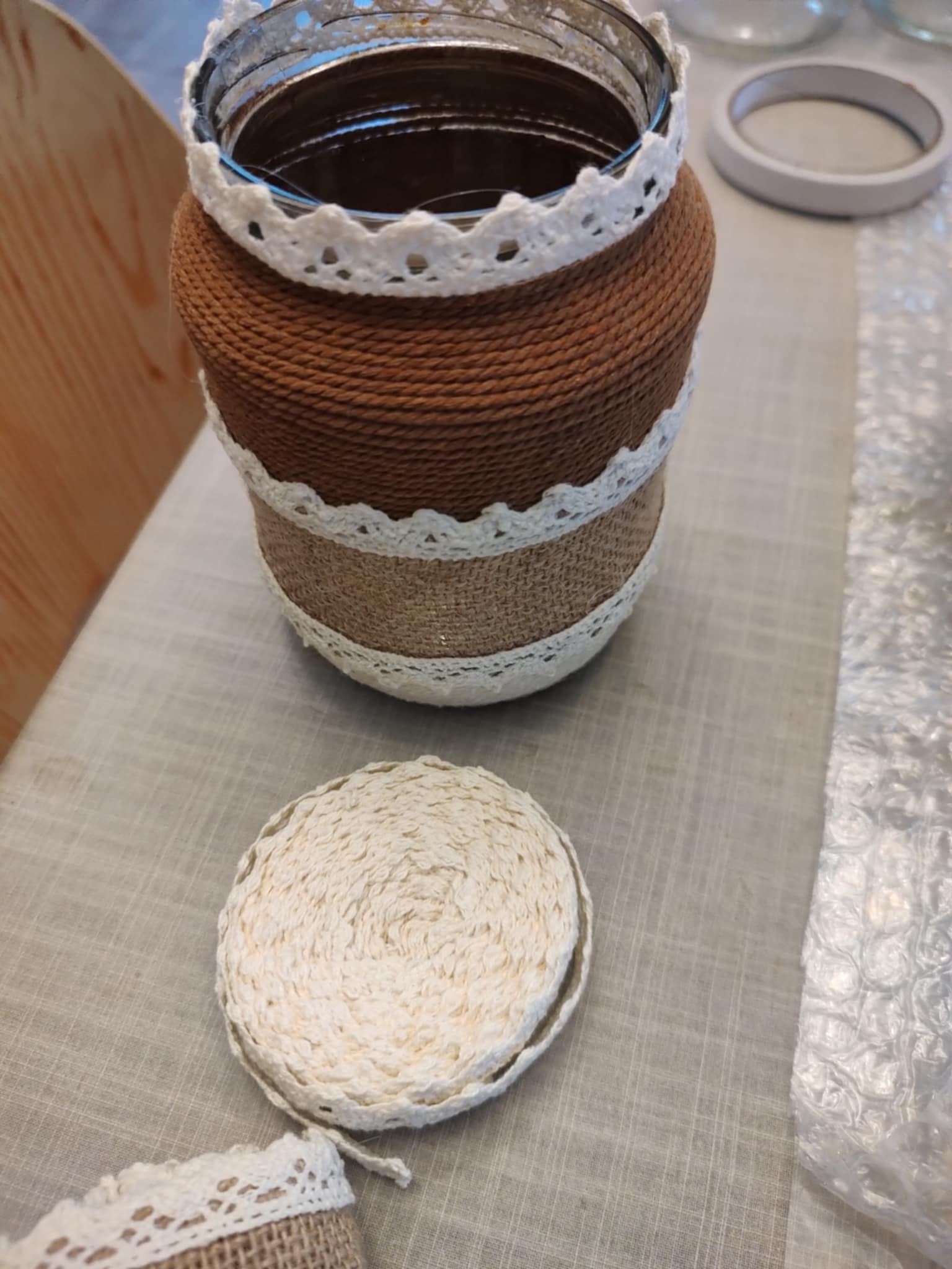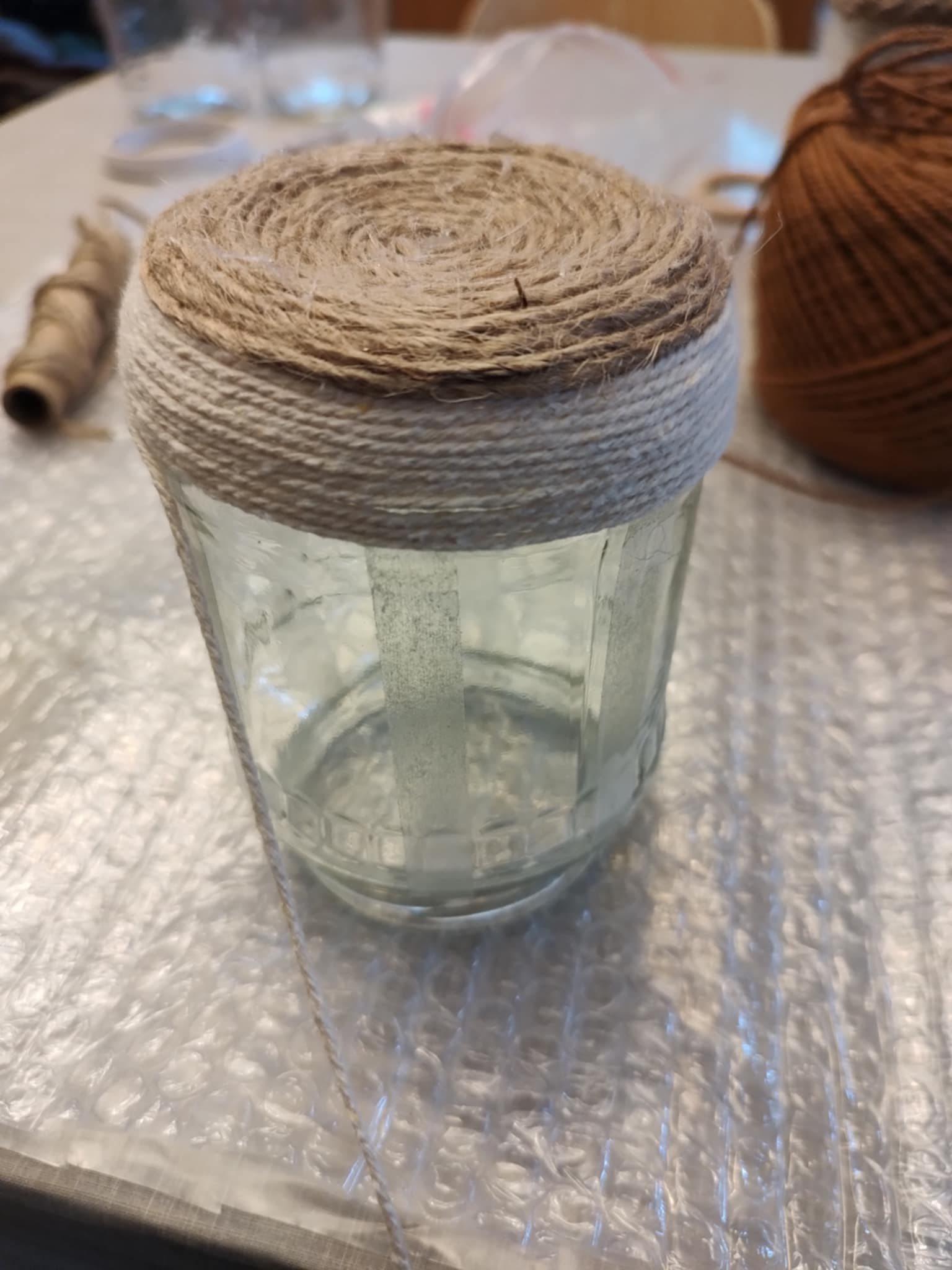 Dózy budou tvořit vnitřní organizér. Nejprve na ně namotejte bílý papírový provázek (nebo tenkou šňůru) od shora dolů, podobně jako u krabice, a zafixujte jej. Poté dózu částečně omotejte hnědým provázkem a nechte horní okraj skla volný. Můžete použít dva různé odstíny provázků – jeden světlejší a jeden tmavší – pro vytvoření vodorovných pruhů.