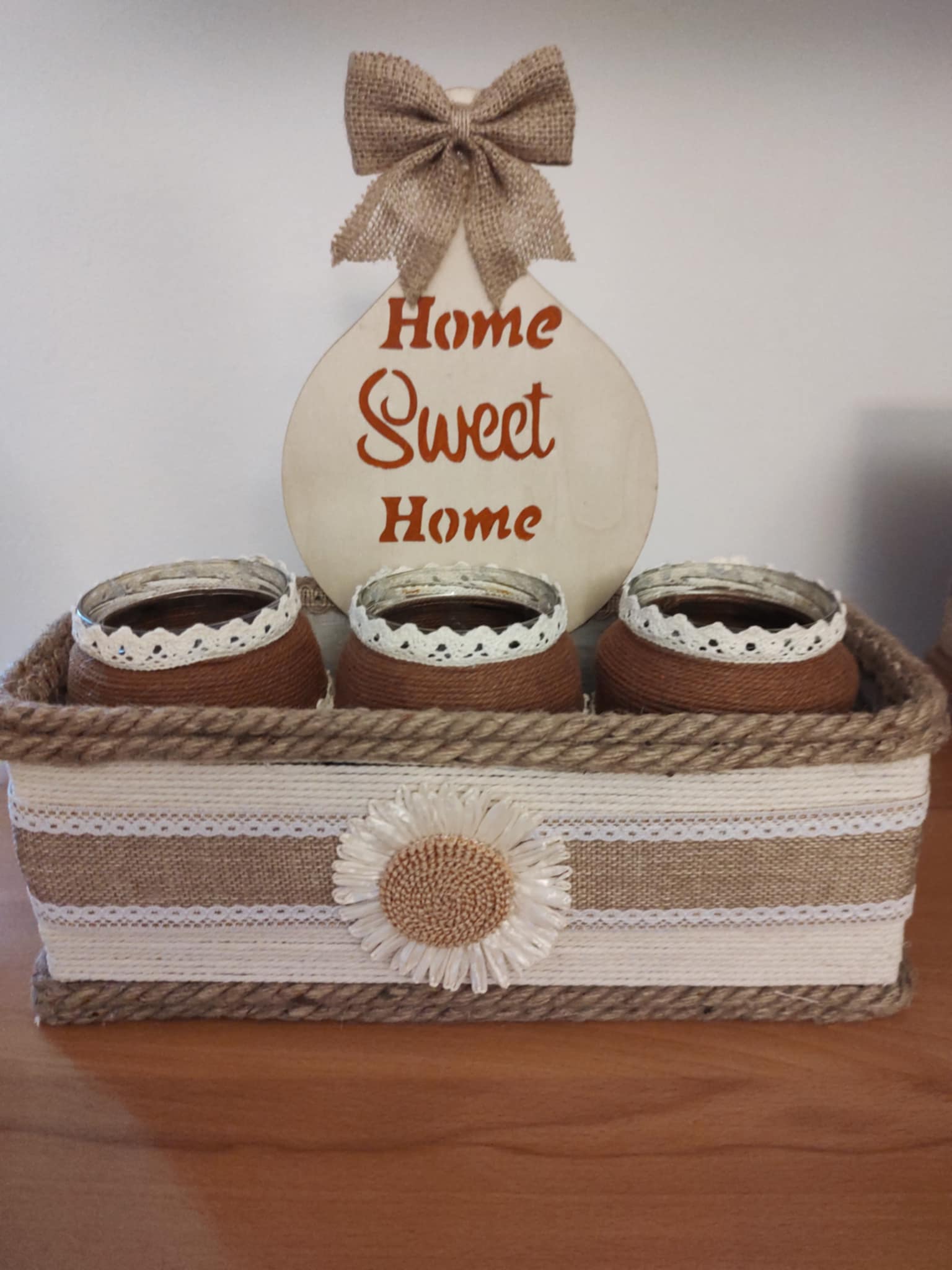 Tato dekorace je skvělý způsob, jak proměnit obyčejnou kartonovou krabici a skleněné dózy na elegantní a praktický úložný box ve stylu „home sweet home“ s rustikálním nádechem. Využijete přírodní provázky, jutu a krajku pro vytvoření útulného vzhledu, ideálního do kuchyně, obývacího pokoje nebo na chalupu.