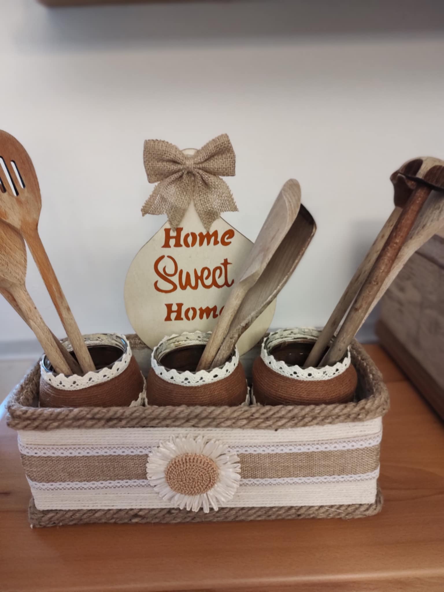 Tento rustikální organizér je ideální pro uložení kuchyňského náčiní, tužek nebo jako jedinečný obal na bylinky. Je to praktická a zároveň stylová dekorace, která v sobě nese kouzlo ruční práce.