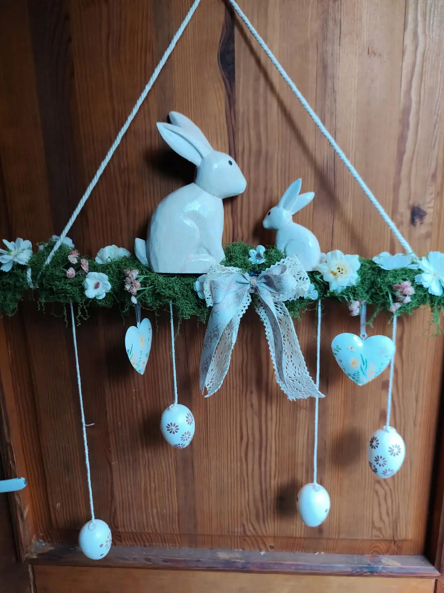 Díky použití bílé a zelené barvy s akcentem přírodního dřeva působí závěs čistě a svěže. Navíc, po Velikonocích stačí sundat vajíčka a zajíčky, vyměnit je za motýlky nebo letní kvítí a máte dekoraci, která vám vydrží až do podzimu.