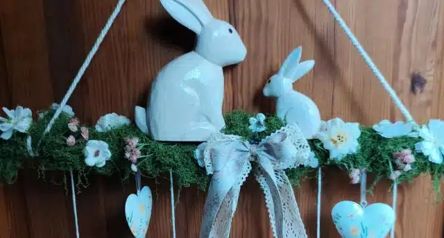 Mezi mechem nechte „rozkvést“ bílé květy. Můžete přidat i drobné sušené kvítky nebo umělé bobule pro větší pestrost. Do středu větve pod zajíčky uvažte bohatou mašli z krajky, která celé dekoraci dodá jemnost.
