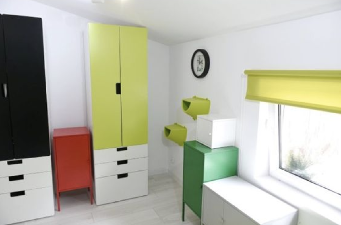 Místnost, ve které visely volně kabely a panoval nepořádek, se proměnila v moderní a minimalistický pokoj pro Mateusze. Design byl promyšlený: pohodlné posezení, dostatek úložných prostorů, příjemná atmosféra. Obývací část navíc doplňuje krb, který dodává prostorům teplo a charakter.