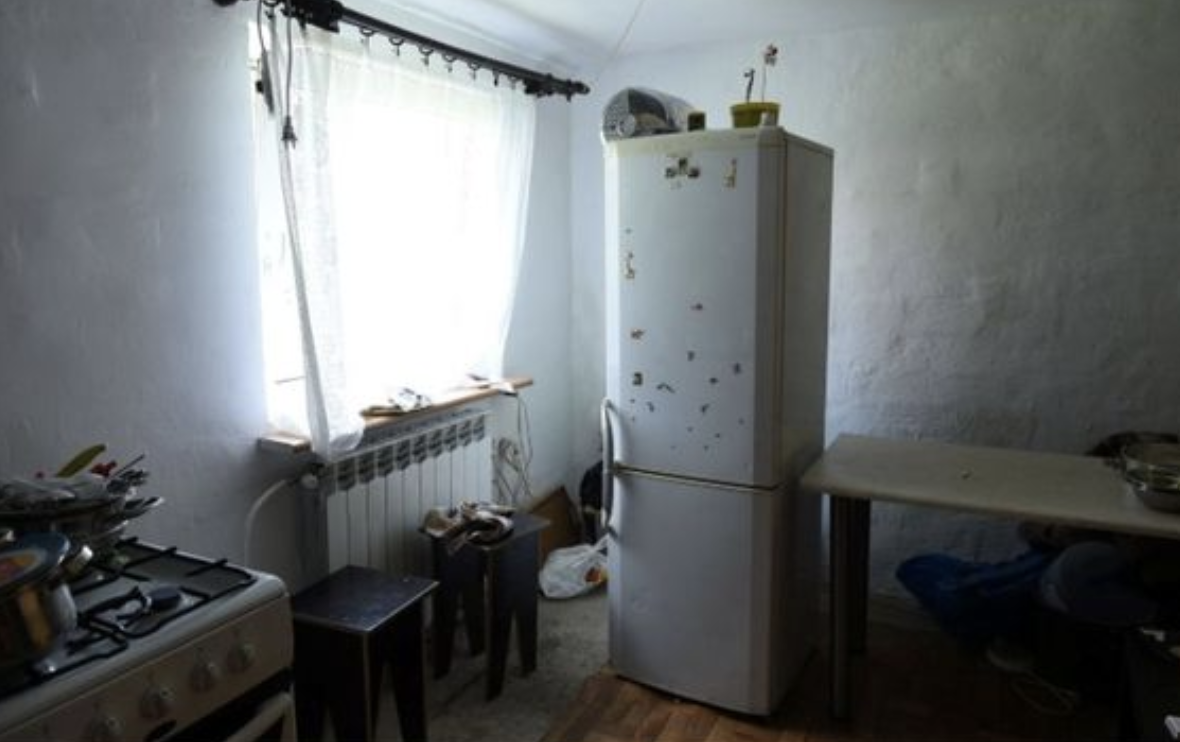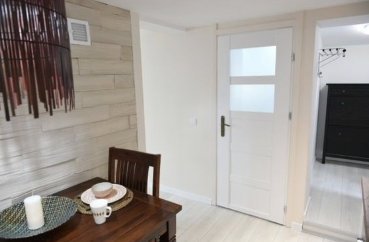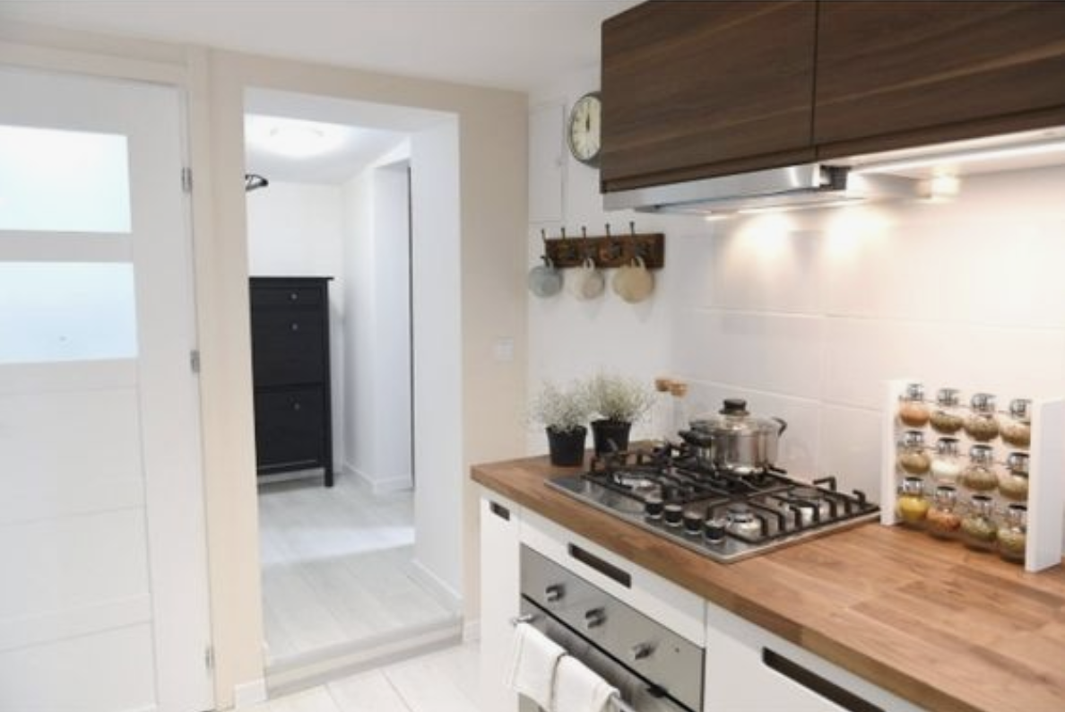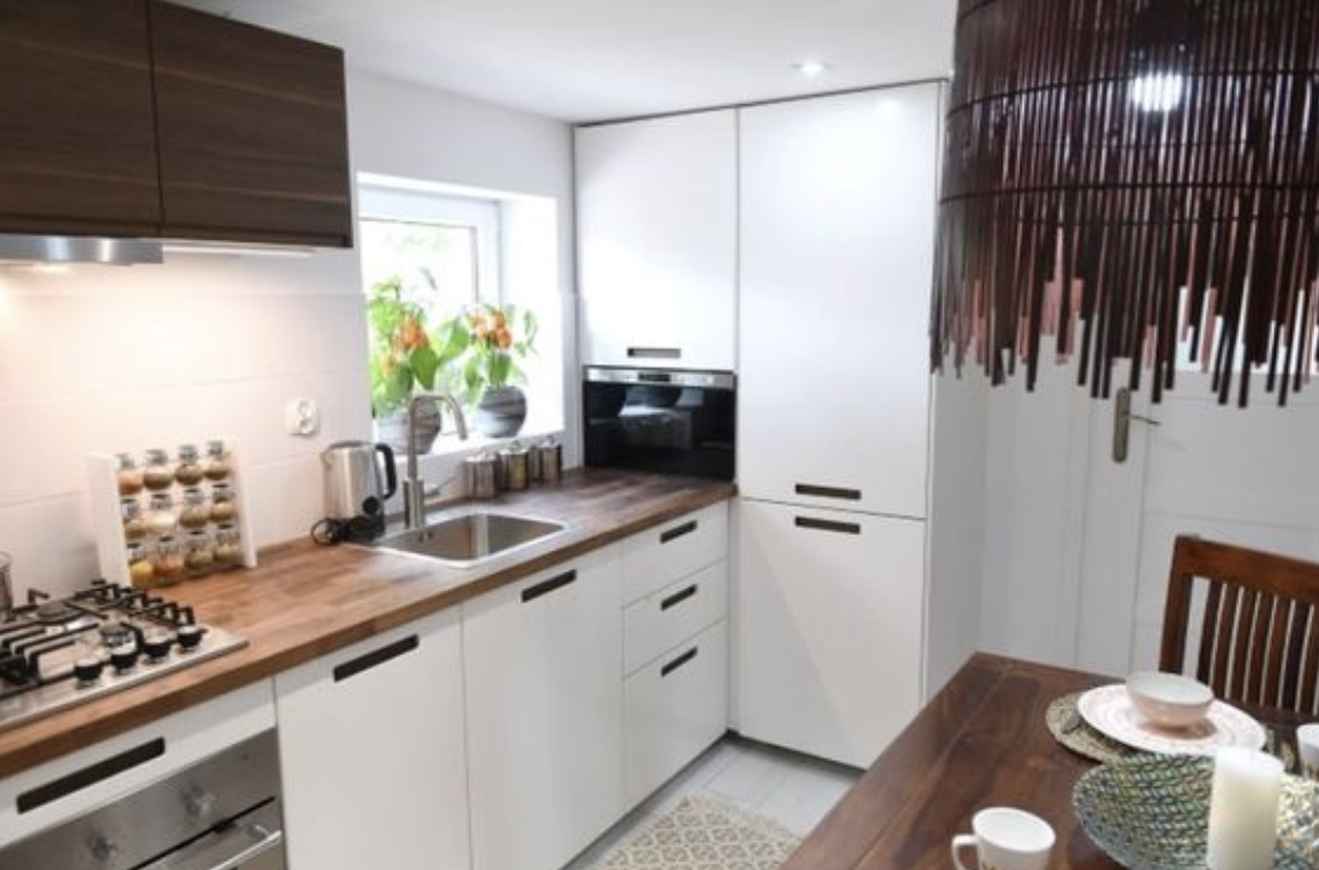 Původní kuchyň byla ve velmi špatném stavu: stará linka, lednice uprostřed místnosti a opotřebované vybavení. Nová podlaha, světlé barvy a nová kuchyňská linka dodaly prostoru svěží a funkční podobu. Bílé dveře, které opticky zvětšily místnost, ladily se světlou podlahou.