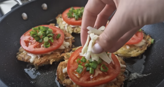 3. Do pánve s rozehřátým olejem pomocí lžíce tvarujte placičky, které smažte na mírném ohni z obou stran dozlatova. Povrch placiček posypejte strouhaným sýrem, naaranžujte kolečka rajčat, ozdobte nakrájenou zelenou cibulkou a znovu posypejte strouhaným sýrem. Dochuťte italskými bylinkami, červenou mletou paprikou, solí a černým mletým pepřem. Přikryjte pokličkou a smažte 5-7 minut na mírném ohni dokřupava.
