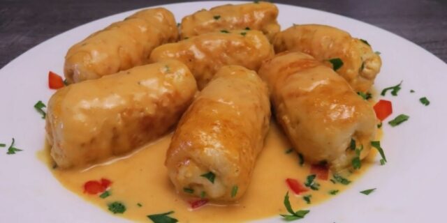 8. Závitky se smetanovou omáčkou podávejte na talíři, přičemž nejprve odstraňte párátka.