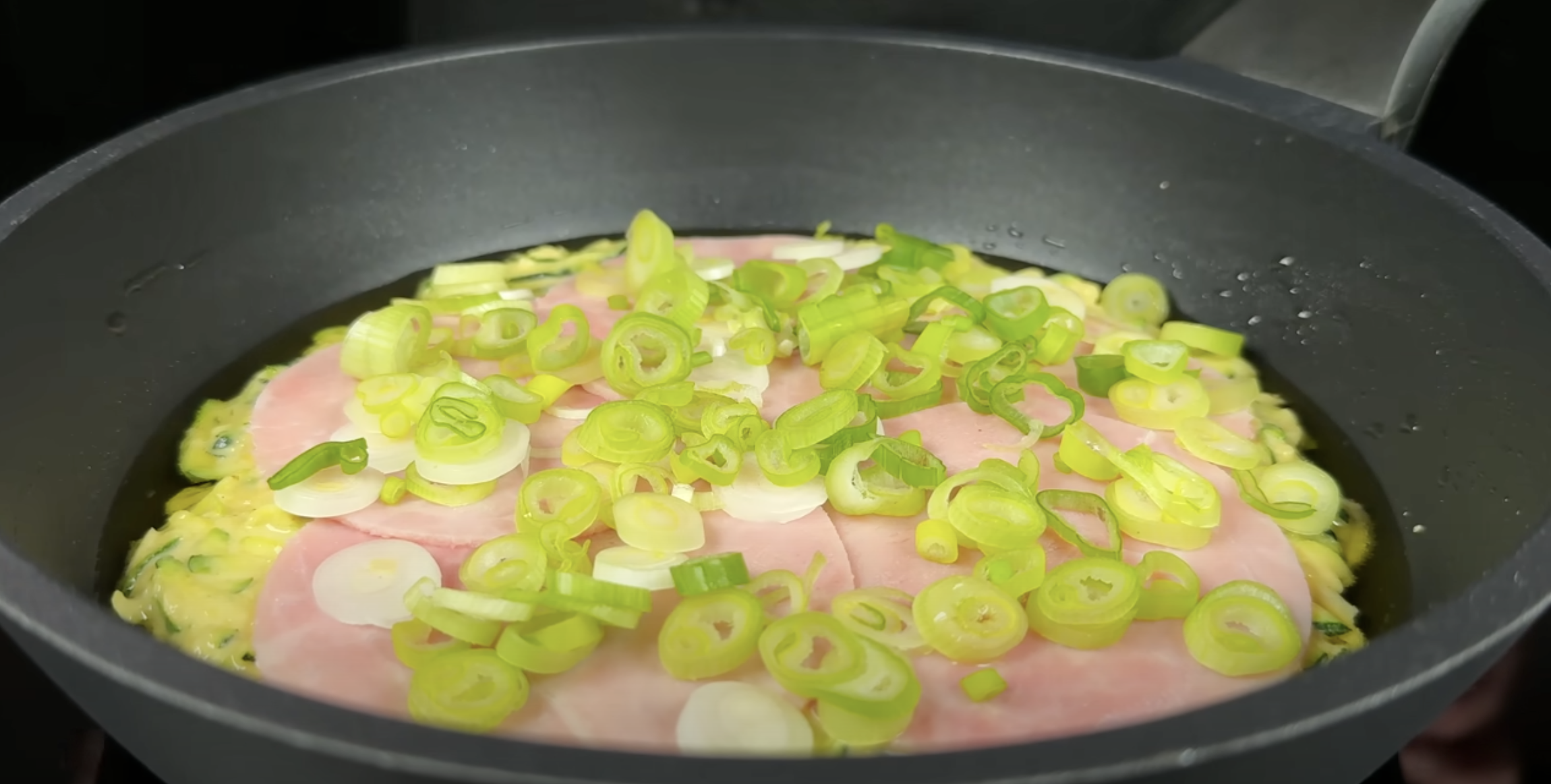 4) Plnění: Na povrch směsi přidejte plátky nebo kostičky šunky, posypte nakrájenou pažitkou a rozloženou mozzarellou.